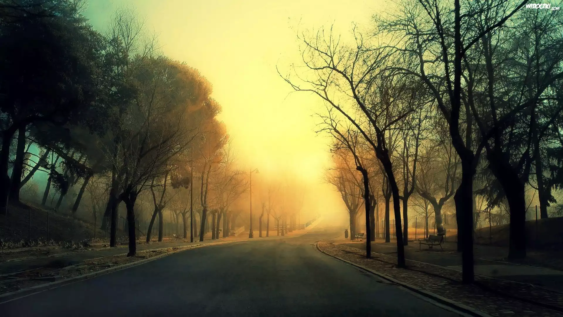 Zdjęcia, Jesień, Droga, Drzewa, Mgła