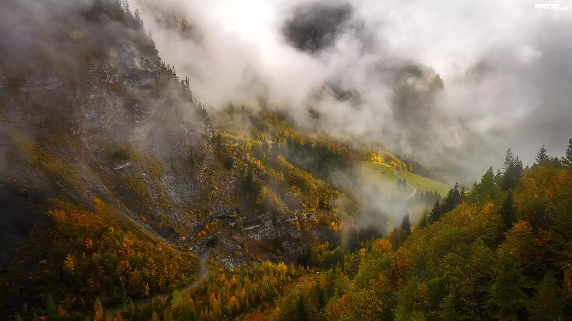 Zdjęcia, Jesień, Mgła, Góry, Lasy, Drzewa, Droga