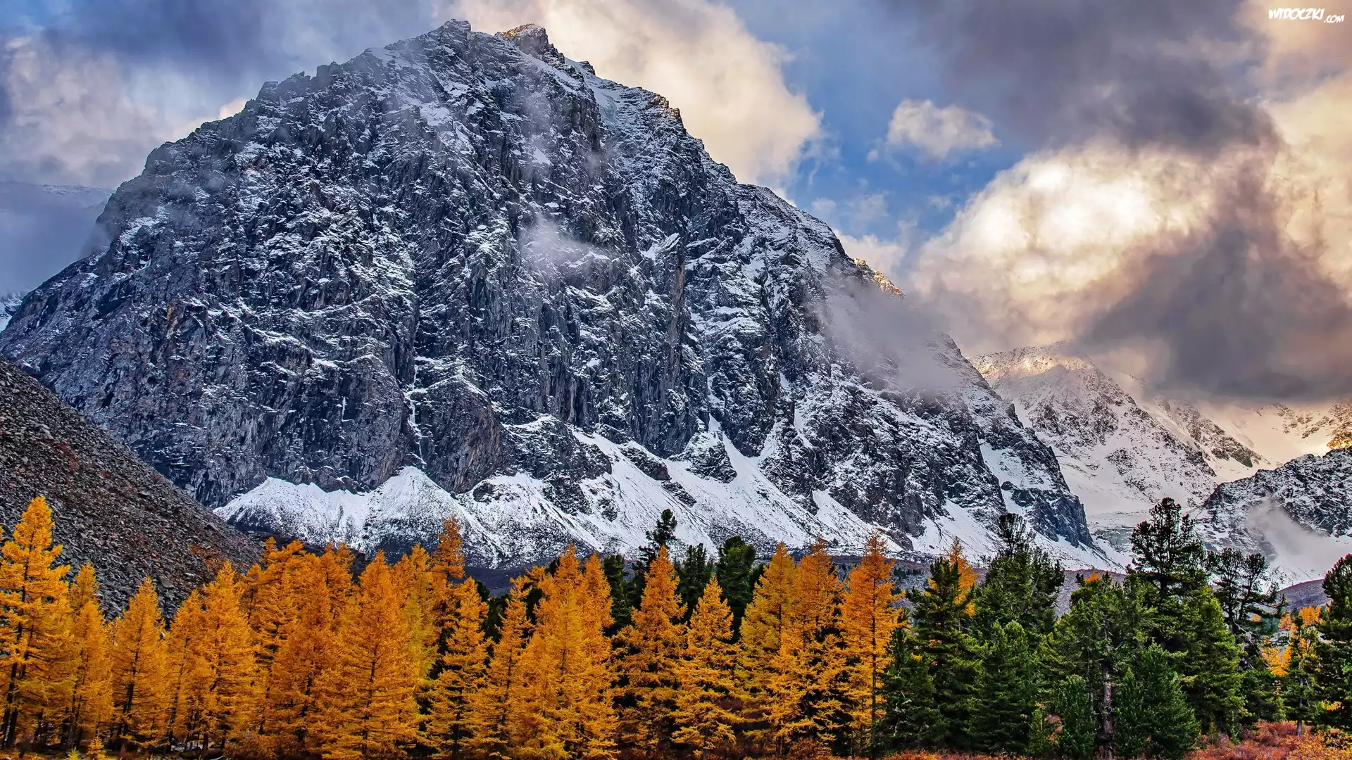 Jesień, Góry, Drzewa, Śnieg