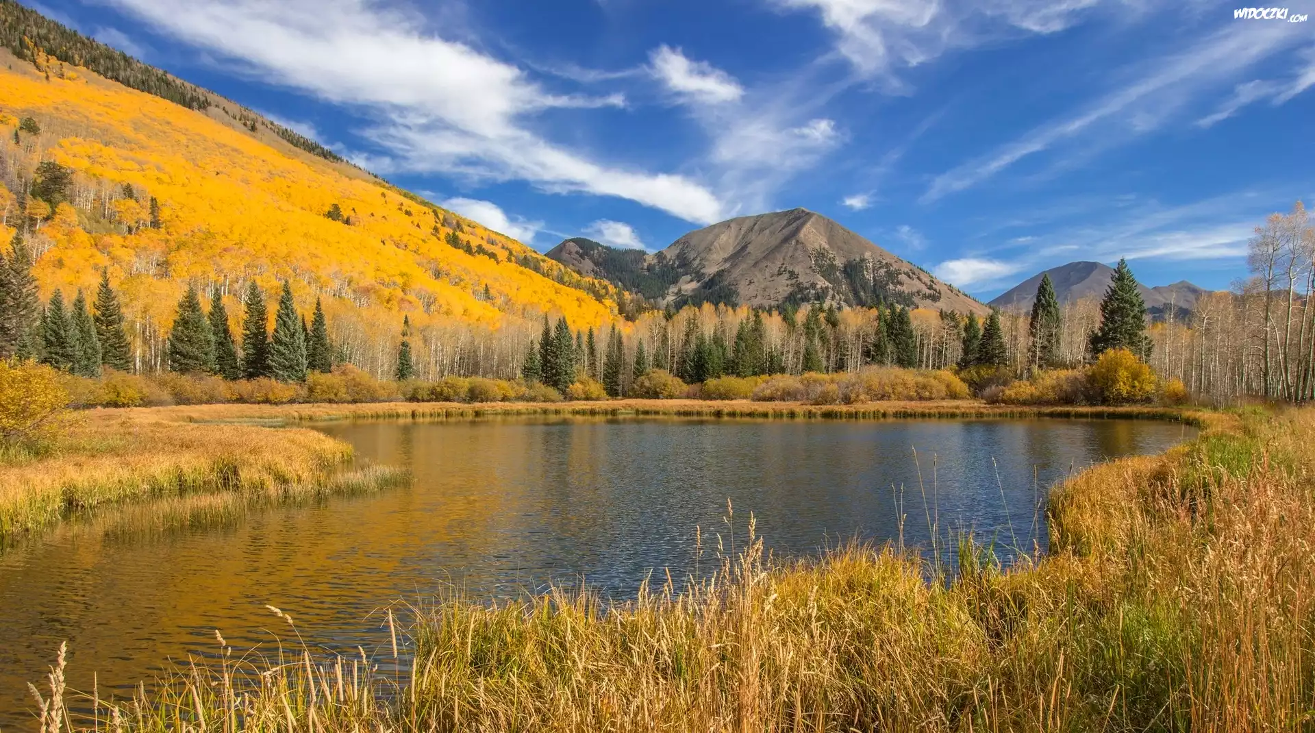 Jesień, Góry, Jezioro, Drzewa, Trawy
