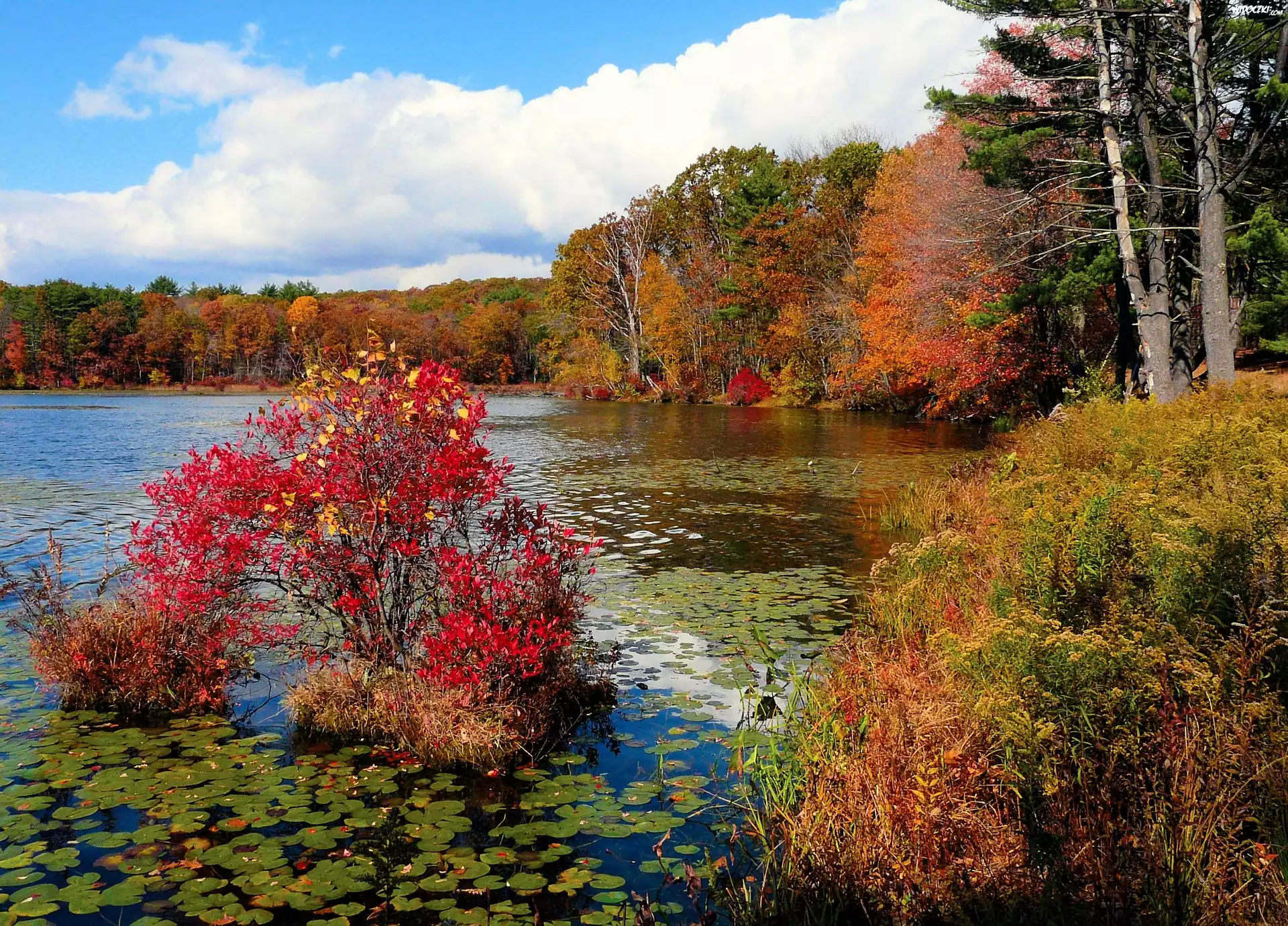 Zdjęcia, Jesień, Jezioro, Drzewa, Lilie