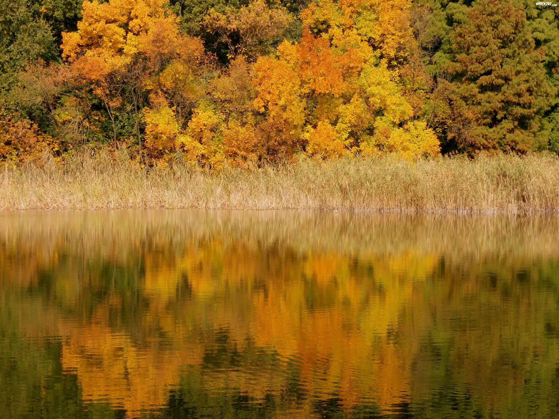 Jesień, Jezioro, Drzewa, Odbicie