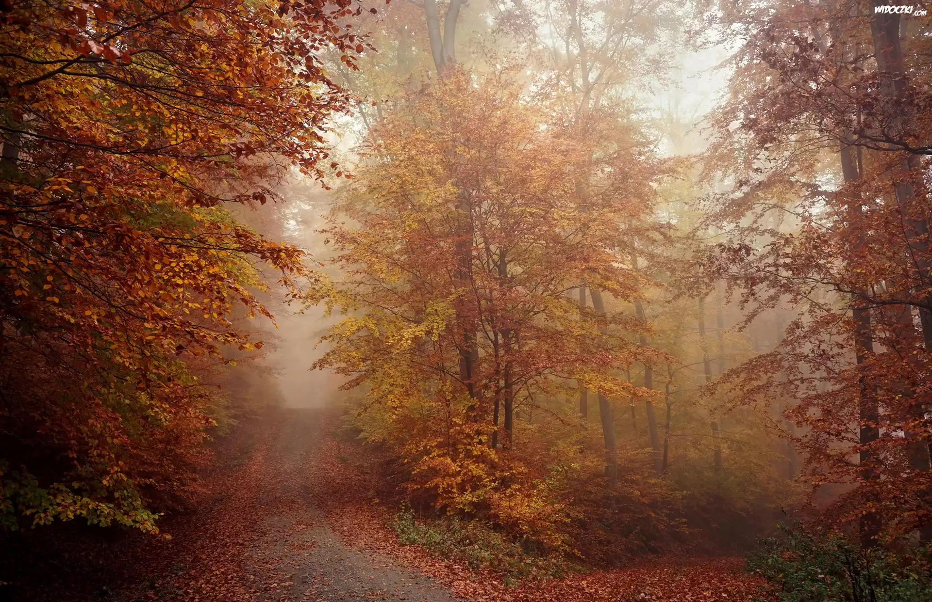 Zdjęcia, Jesień, Droga, Las, Drzewa, Mgła