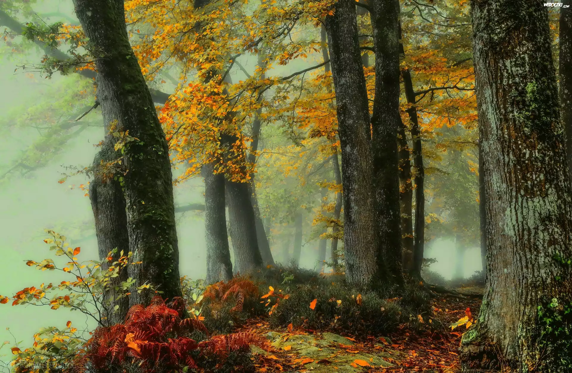 Zdjęcia, Jesień, Las, Drzewa, Mgła
