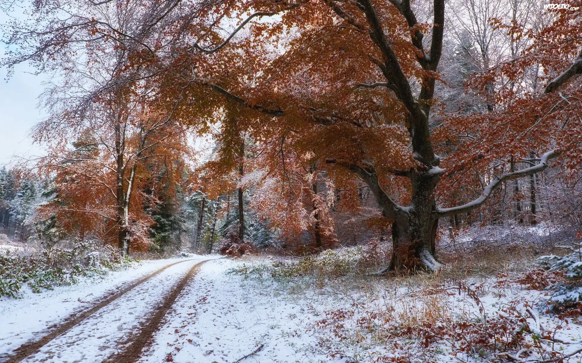Zdjęcia, Jesień, Śnieg, Las, Drzewa, Droga