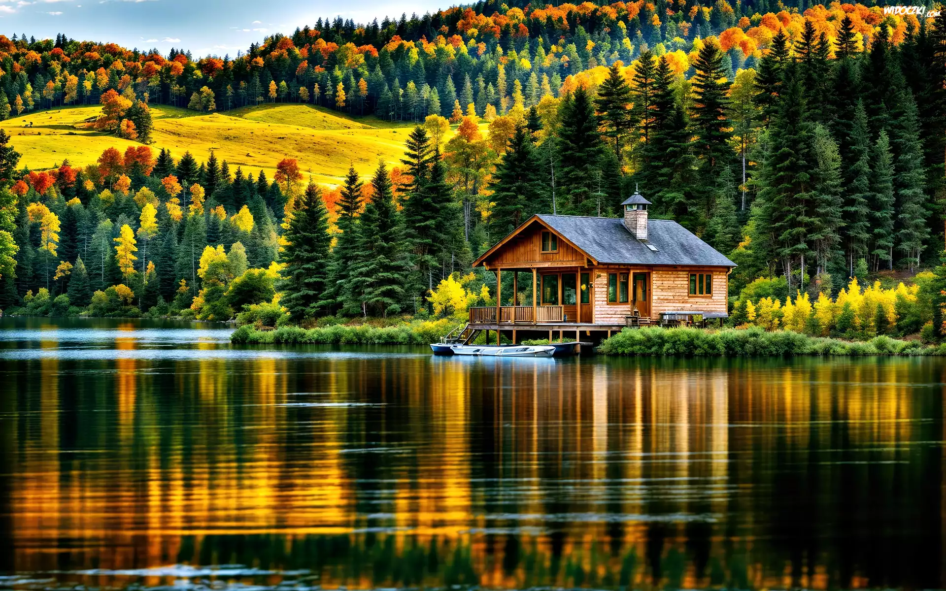 Dom, Jezioro, Lasy, Jesień, Grafika, Drzewa