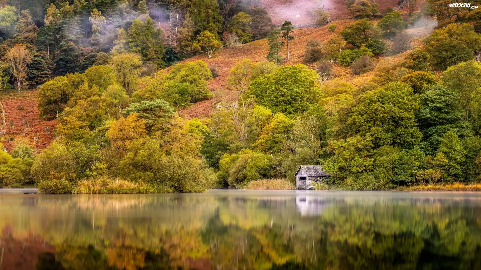 Zdjęcia, Jesień, Jezioro, Las, Drzewa, Odbicie, Mgła, Chata, Park Narodowy Lake District, Kumbria, Anglia
