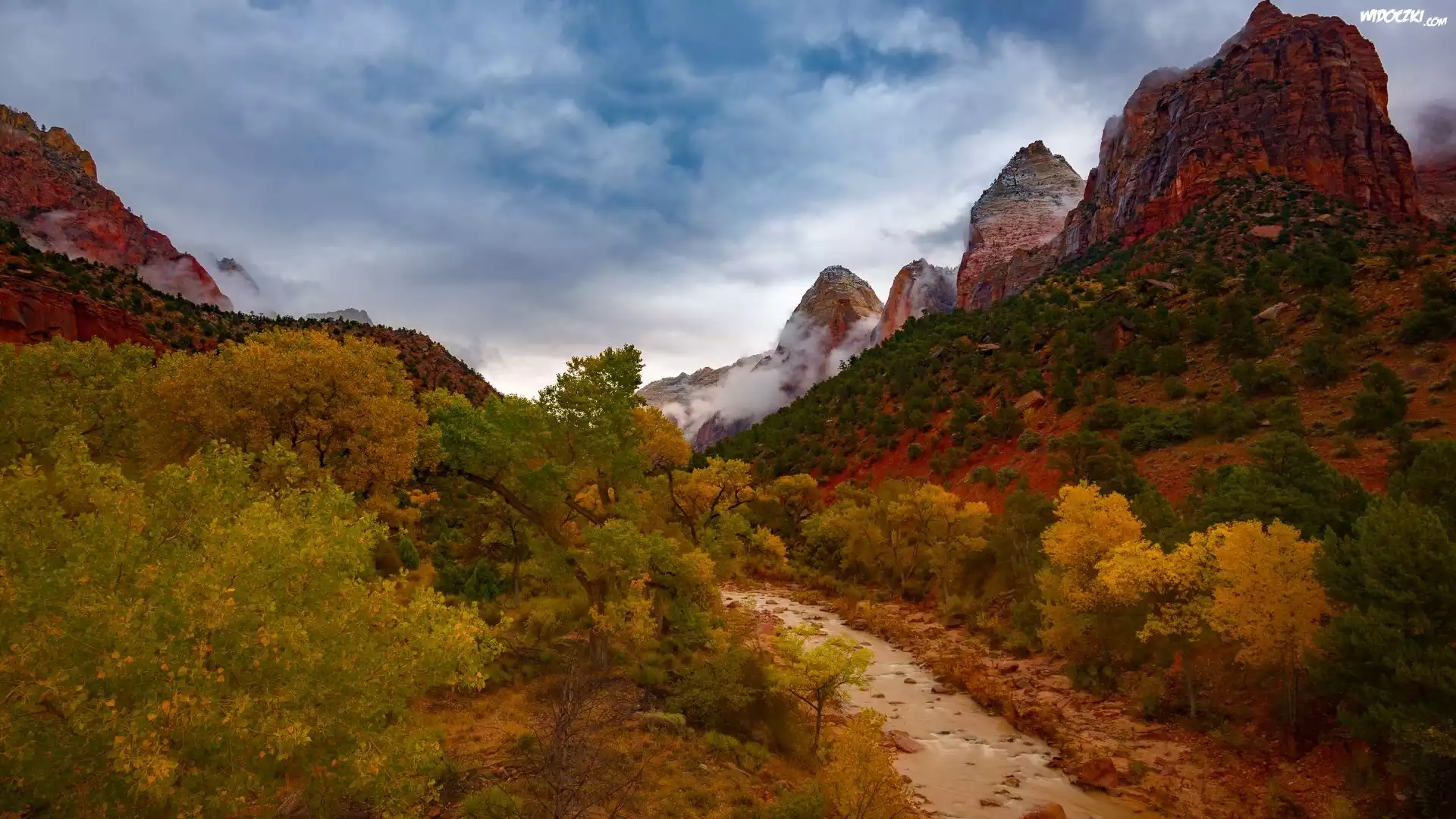 Zdjęcia, Jesień, Góry, Rzeka, Drzewa, Chmury