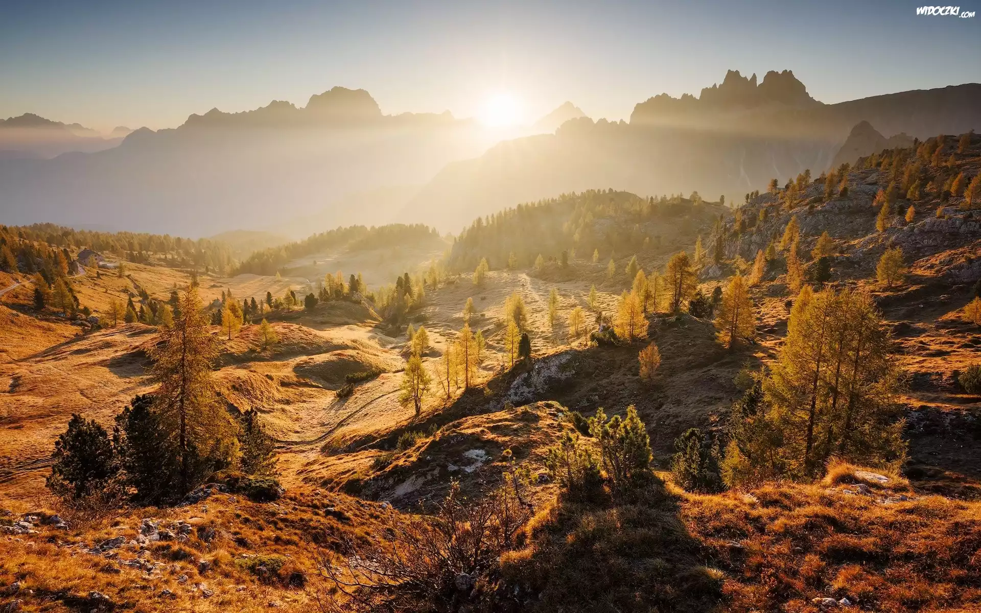 Góry, Dolomity, Włochy, Jesień, Roślinność, Drzewa