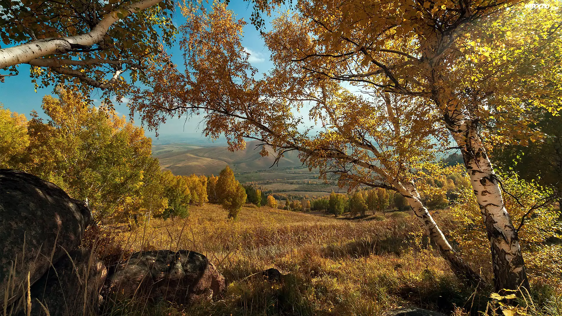 Jesień, Wzgórza, Drzewa, Brzozy