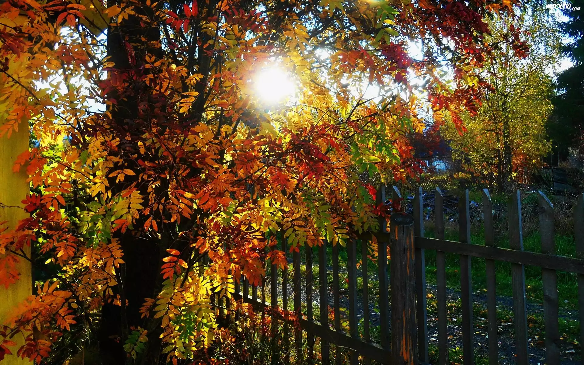 Jesień, Ogród, Drzewo, Słońce