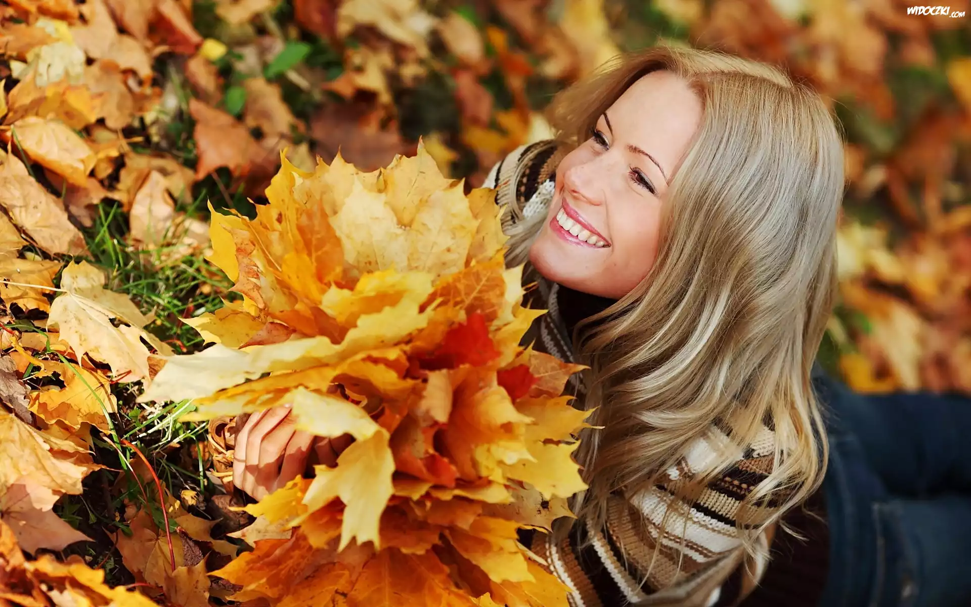Zdjęcia, Jesień, Uśmiechnięta, Dziewczyna, Liście
