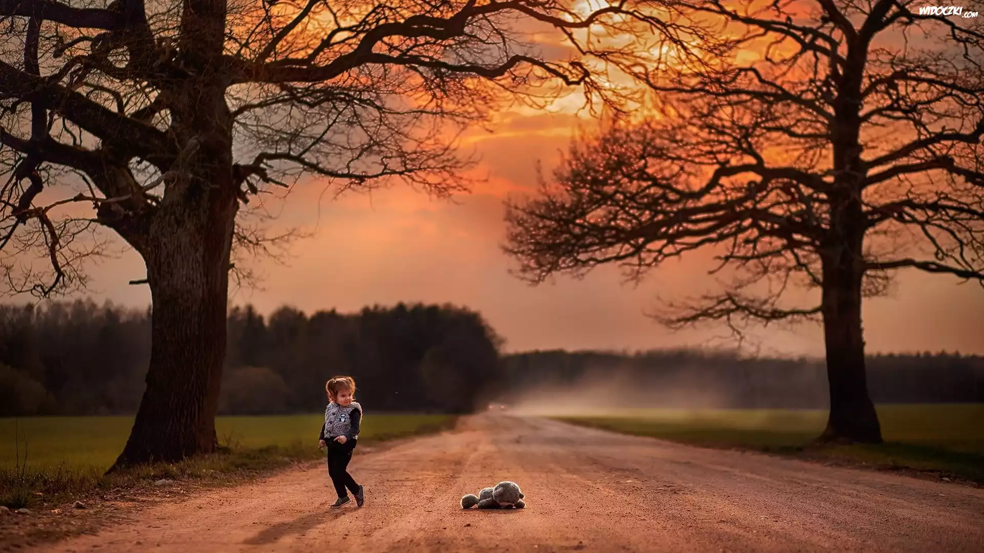 Zdjęcia, Jesień, Droga, Drzewa, Dziewczynka, Miś