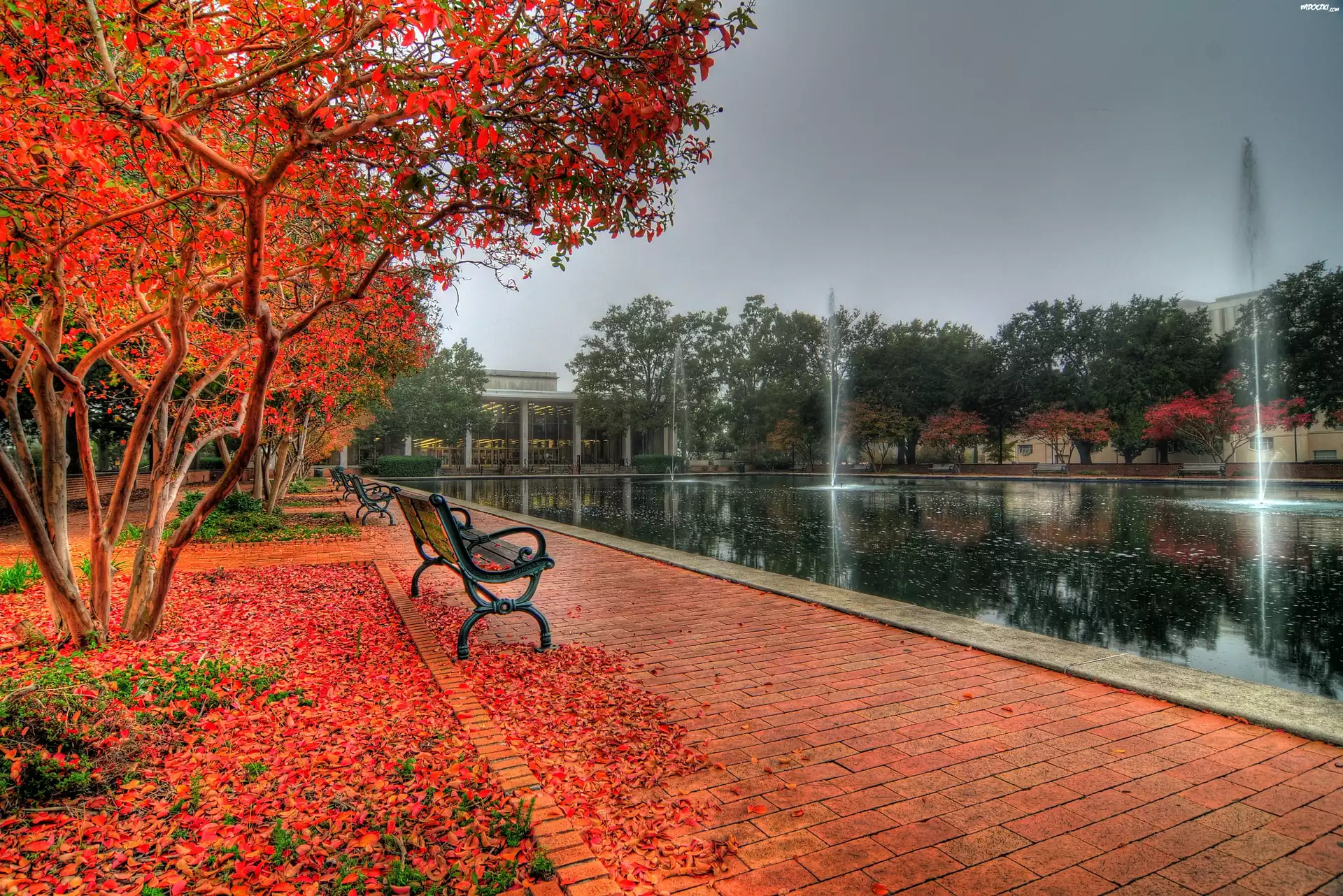 Jesień, Park, Fontanny, Ławka