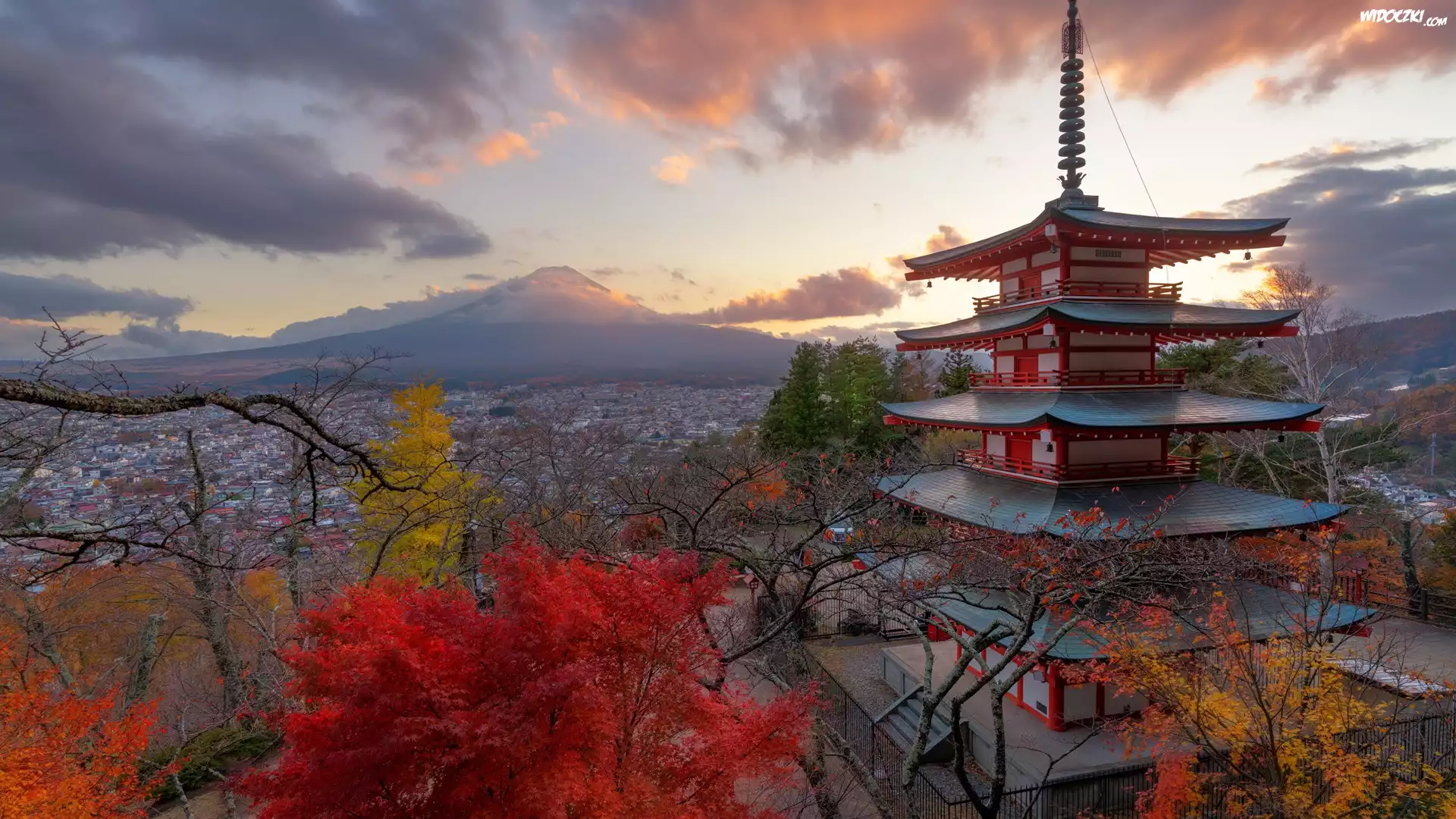 Świątynia, Chureito Pagoda, Góra, Fudżi, Mount Fuji, Drzewa, Jesień, Miasto Fujiyoshida, Prefektura Yamanashi, Wyspa Honsiu, Japonia |