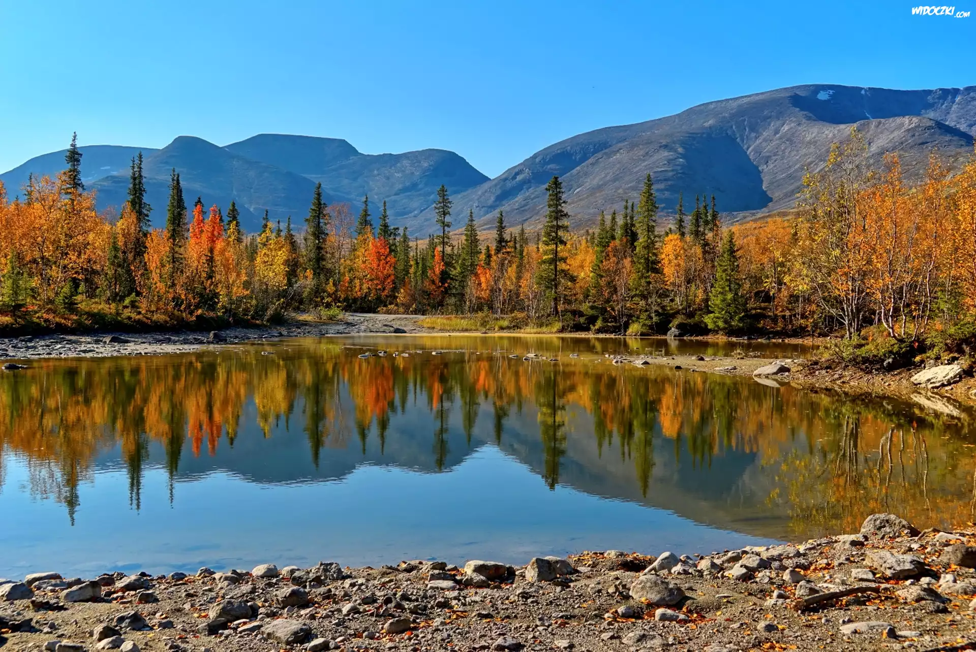 Jesień, Jezioro, Drzewa, Góry, Kamienie