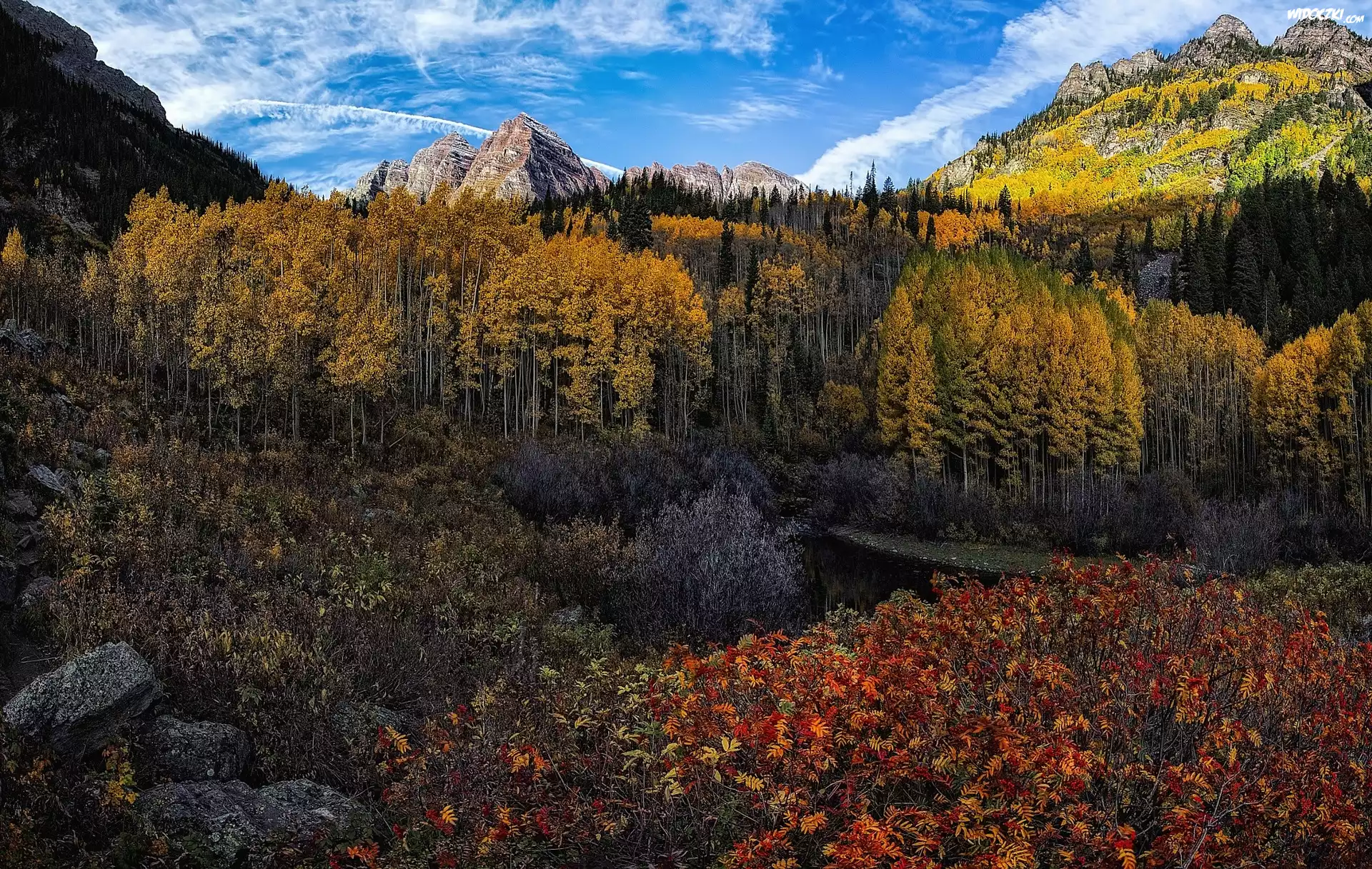 Góra, Niebo Wodospad Góry, urwisko Góra, Rzeki Uschnięte, Kwiaty Wielkie, Urwisko, Jesienne, Drzewa Góra Jesienny, Widok, Przez, Okno Las, Żółte, Liście, Słońce Singpost, Strzałka, Słup Jesień, Drzewo, Kamienie Góra Drewniany Most, rzeczka, Jesień Góra, Chmury Jesień, Drzewa, Góry