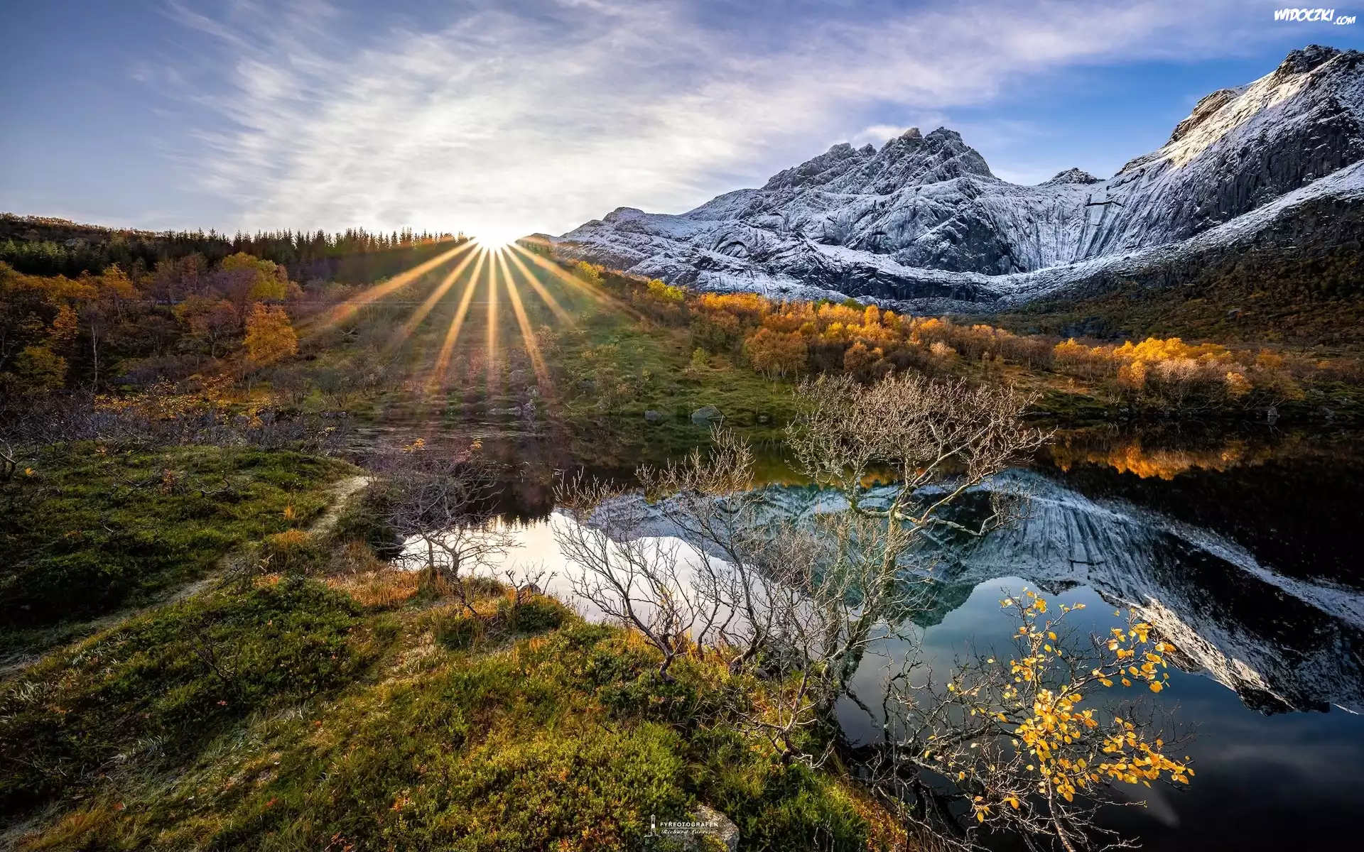 Zdjęcia, Norwegia, Lofoty, Góry, Jezioro, Promienie słońca, Drzewa, Jesień