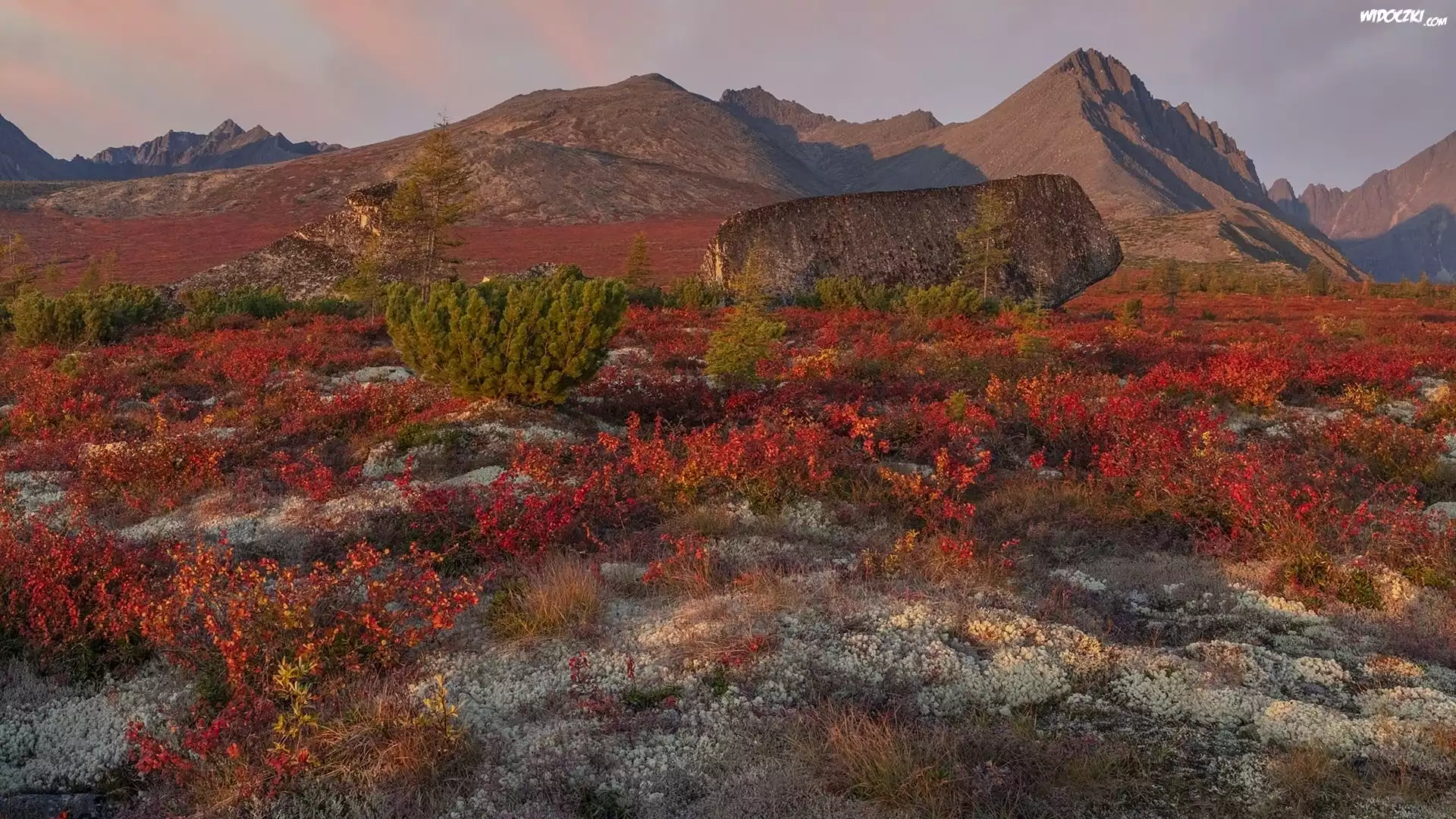 Jesień, Góry Kołymskie, Czerwone, Rośliny, Skały, Iglak, Kołyma, Rosja