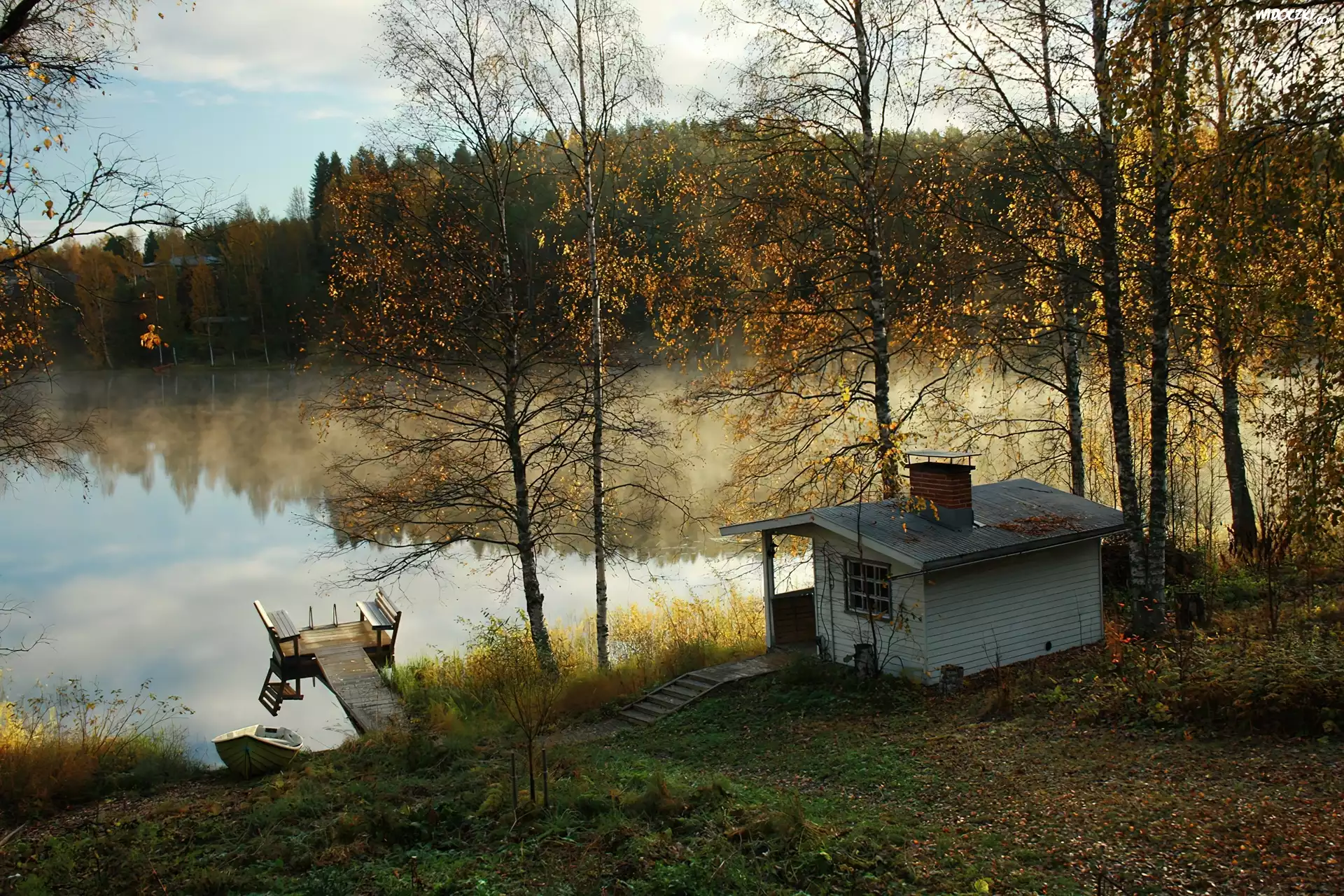 Zdjęcia, Jesień, Drzewa, Domek, Jeziorko, Pomost