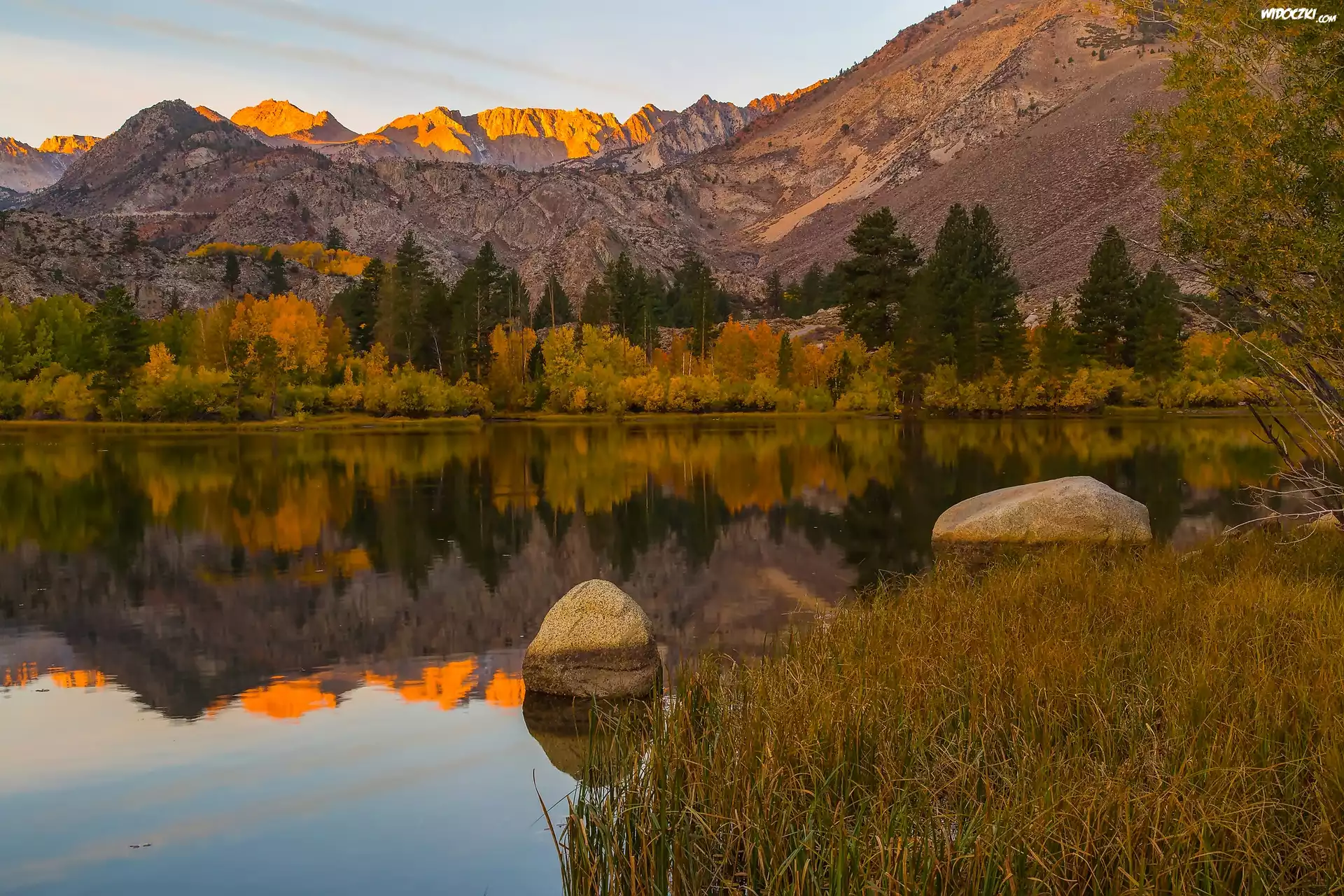 Jesień, Góry, Drzewa, Jezioro, Kamienie