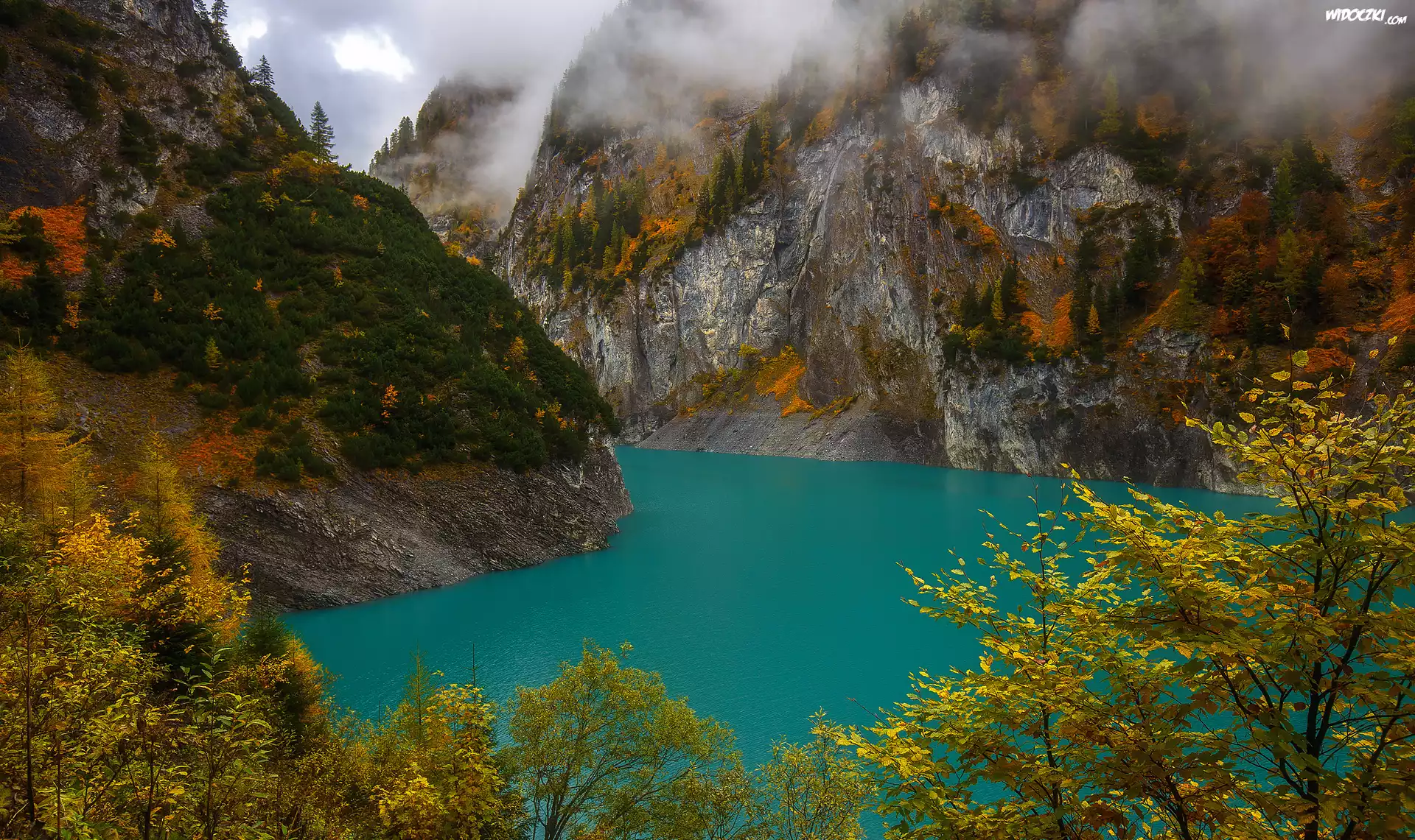 Zdjęcia, Jesień, Góry, Mgła, Jezioro, Drzewa