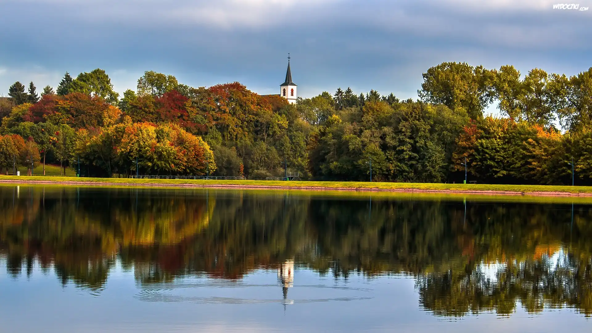 Zdjęcia, Jesień, Drzewa, Wieżyczka, Kościół, Jezioro, Odbicie