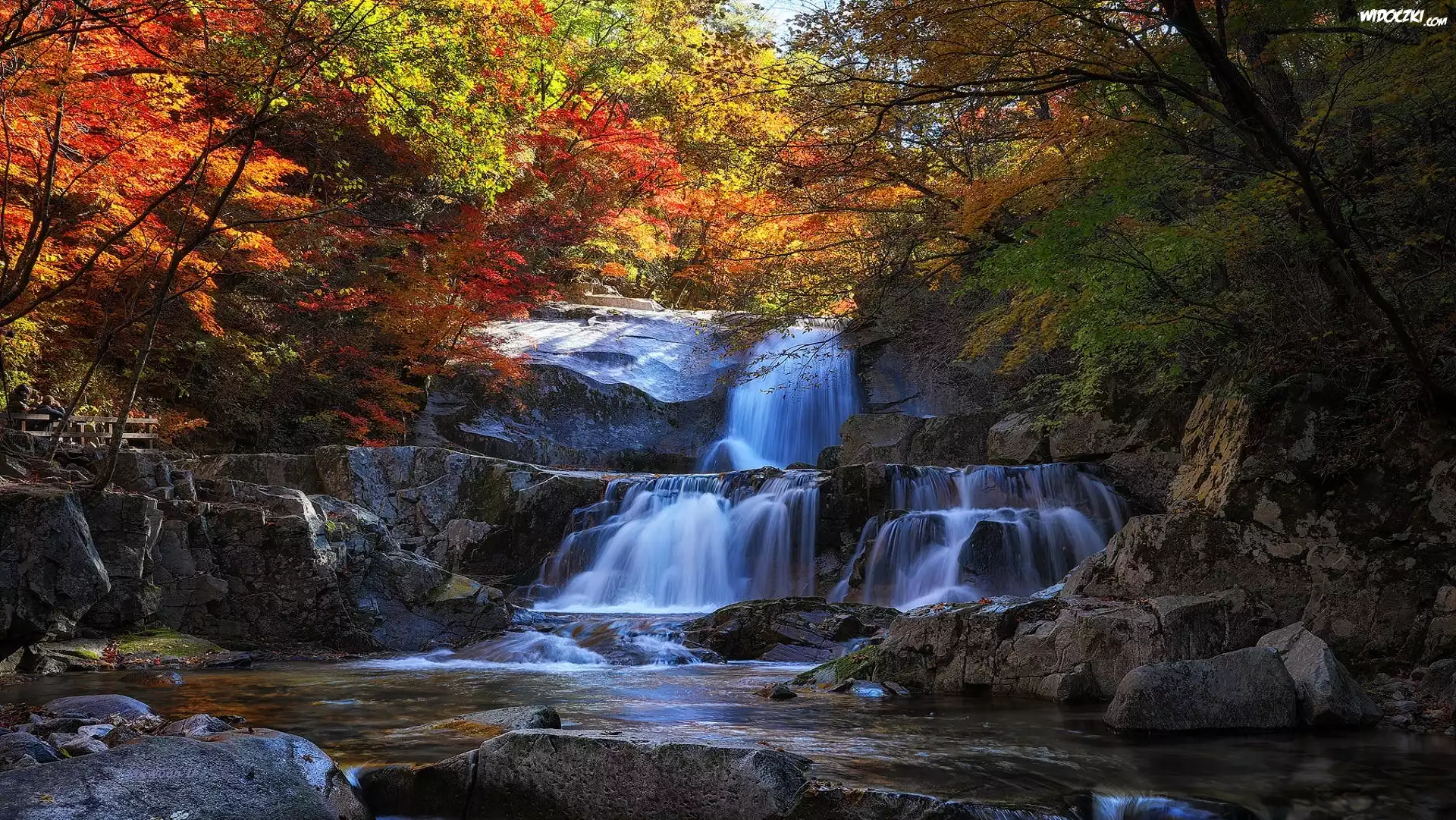 Zdjęcia, Jesień, Las, Drzewa, Wodospad, Kamienie, Skały