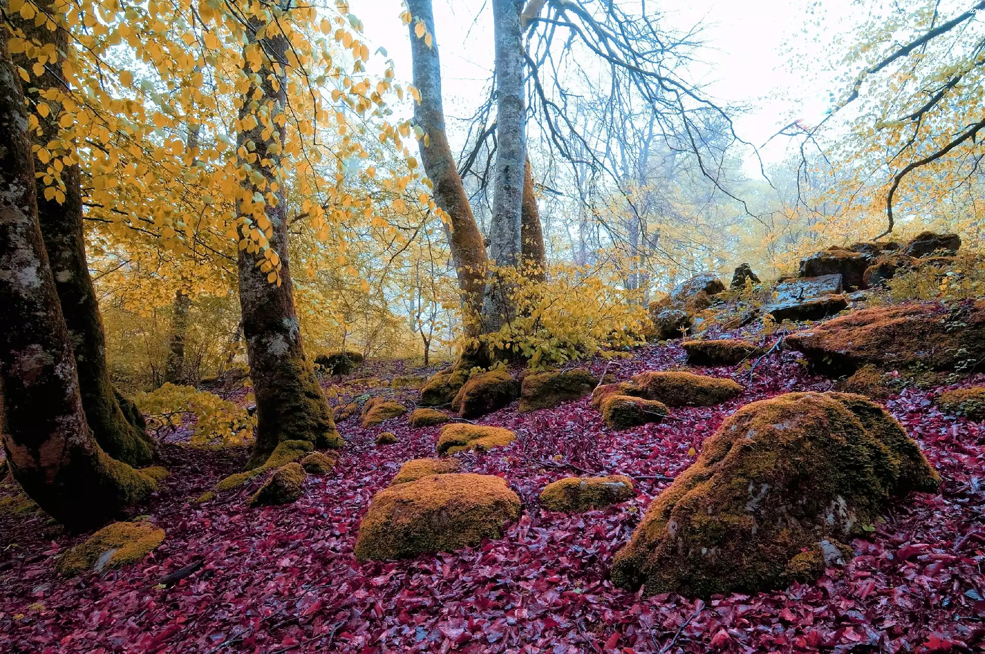 Zdjęcia, Jesień, Las, Omszone, Kamienie, Liście