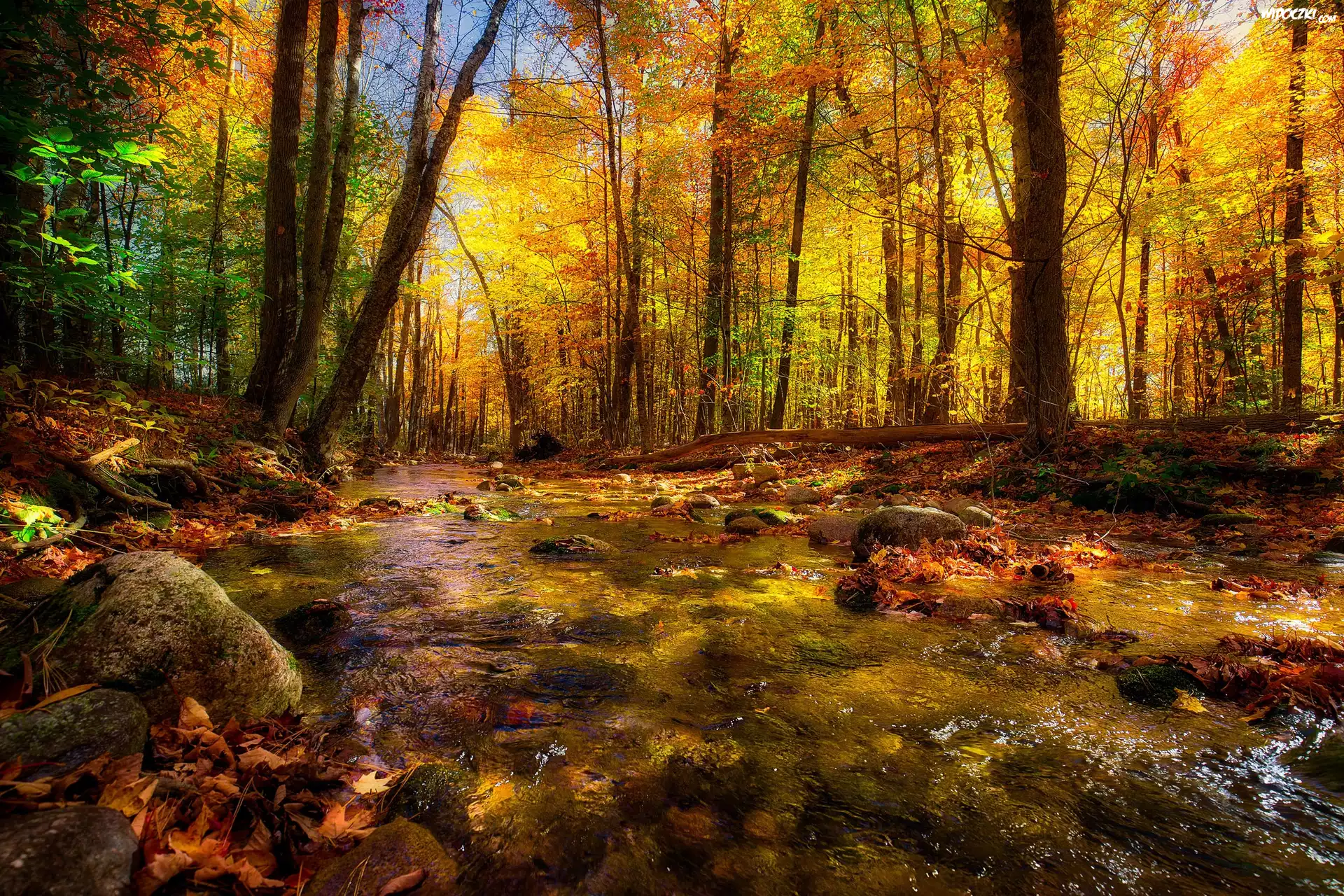 Zdjęcia, Jesień, Las, Rzeka, Kamienie, Liście
