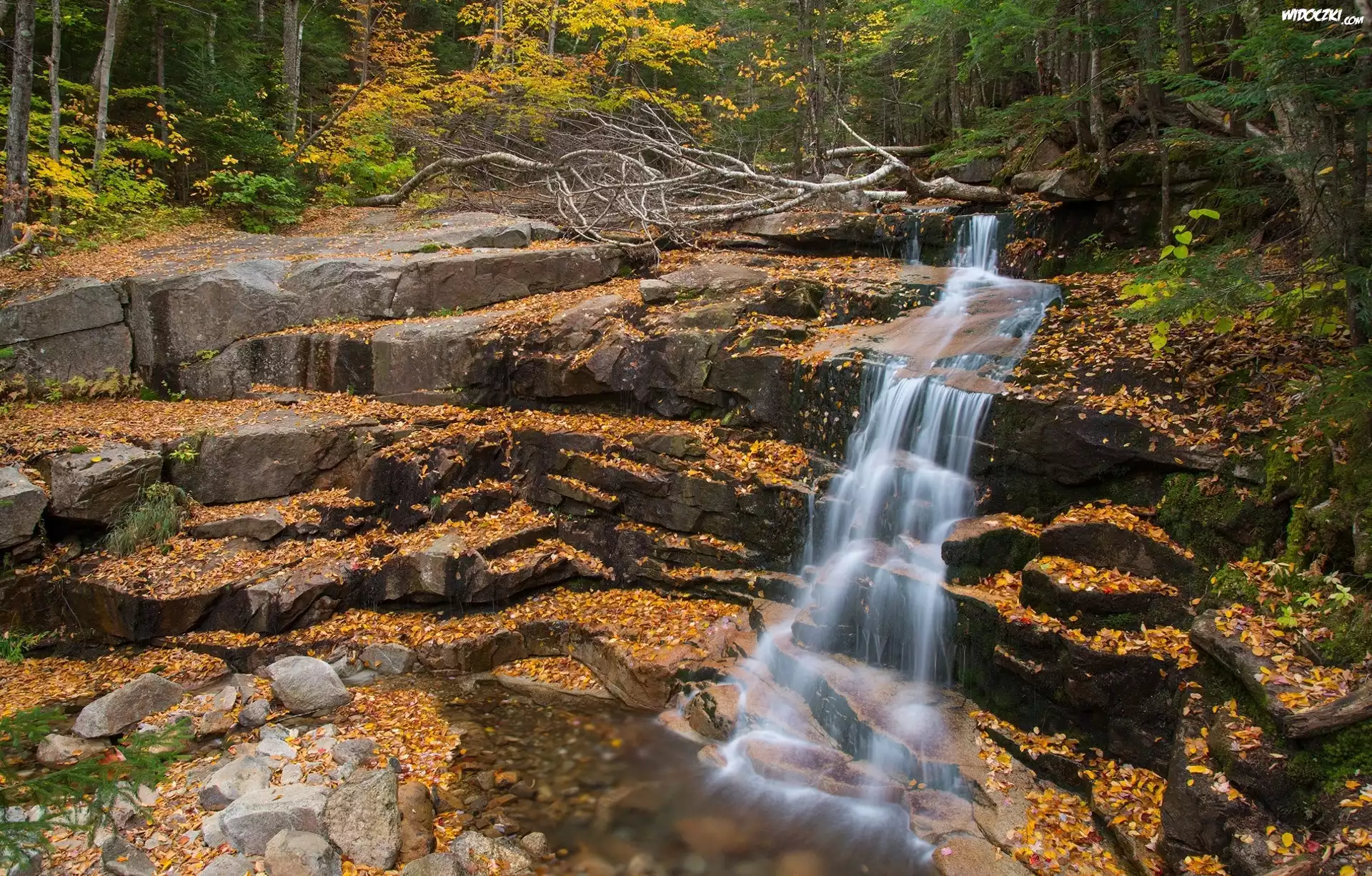 Zdjęcia, Jesień, Wodospad, Kamienie, Liście