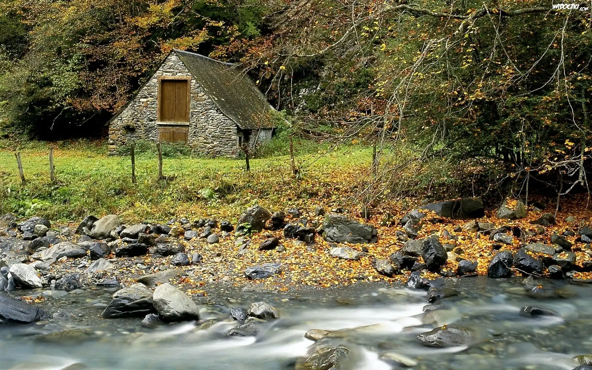 Jesień, Las, Rzeka, Głazy, Kamienna, Chałupa
