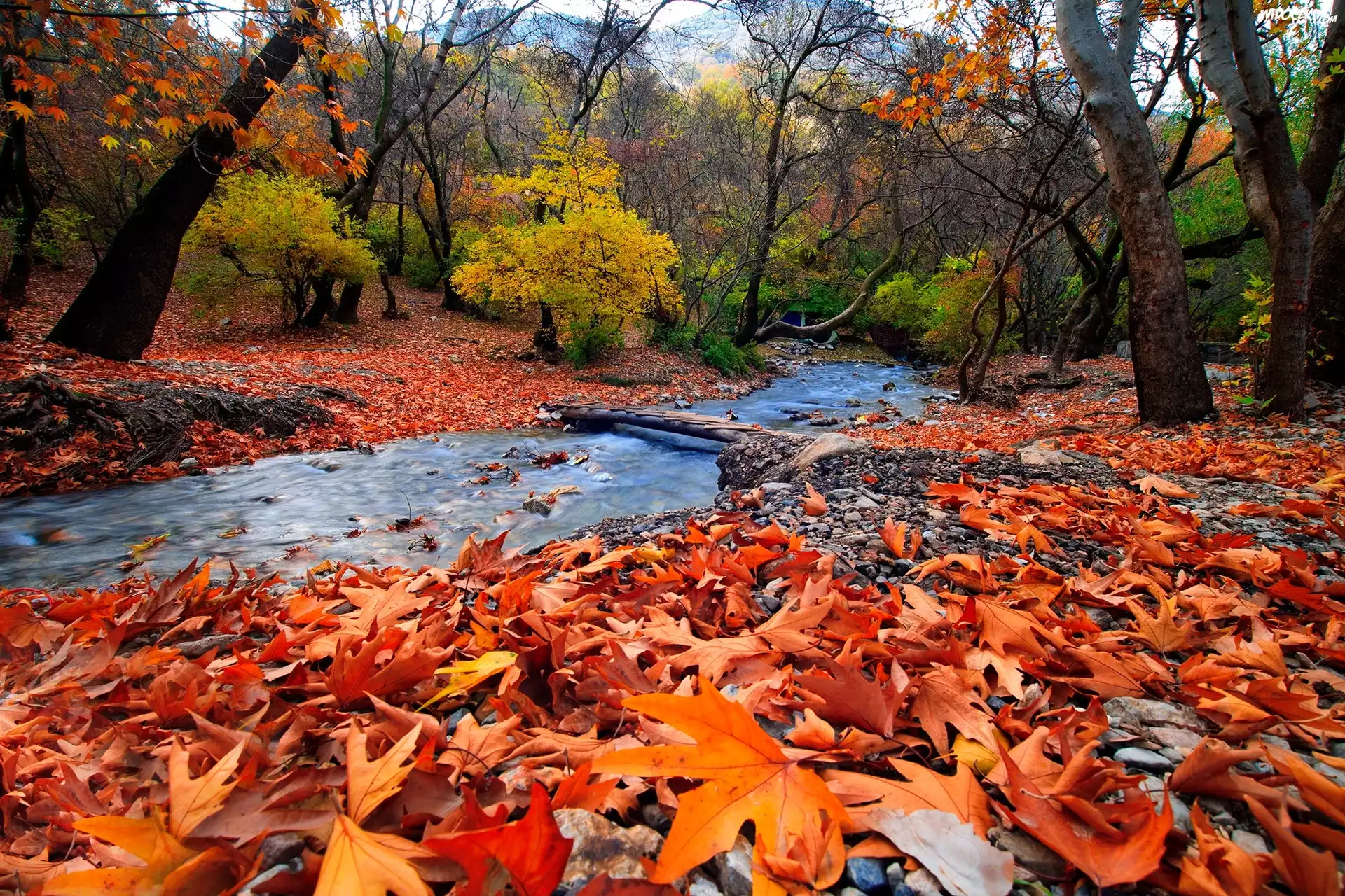 Jesień, Las, Rzeka, Kładka, Drzewa