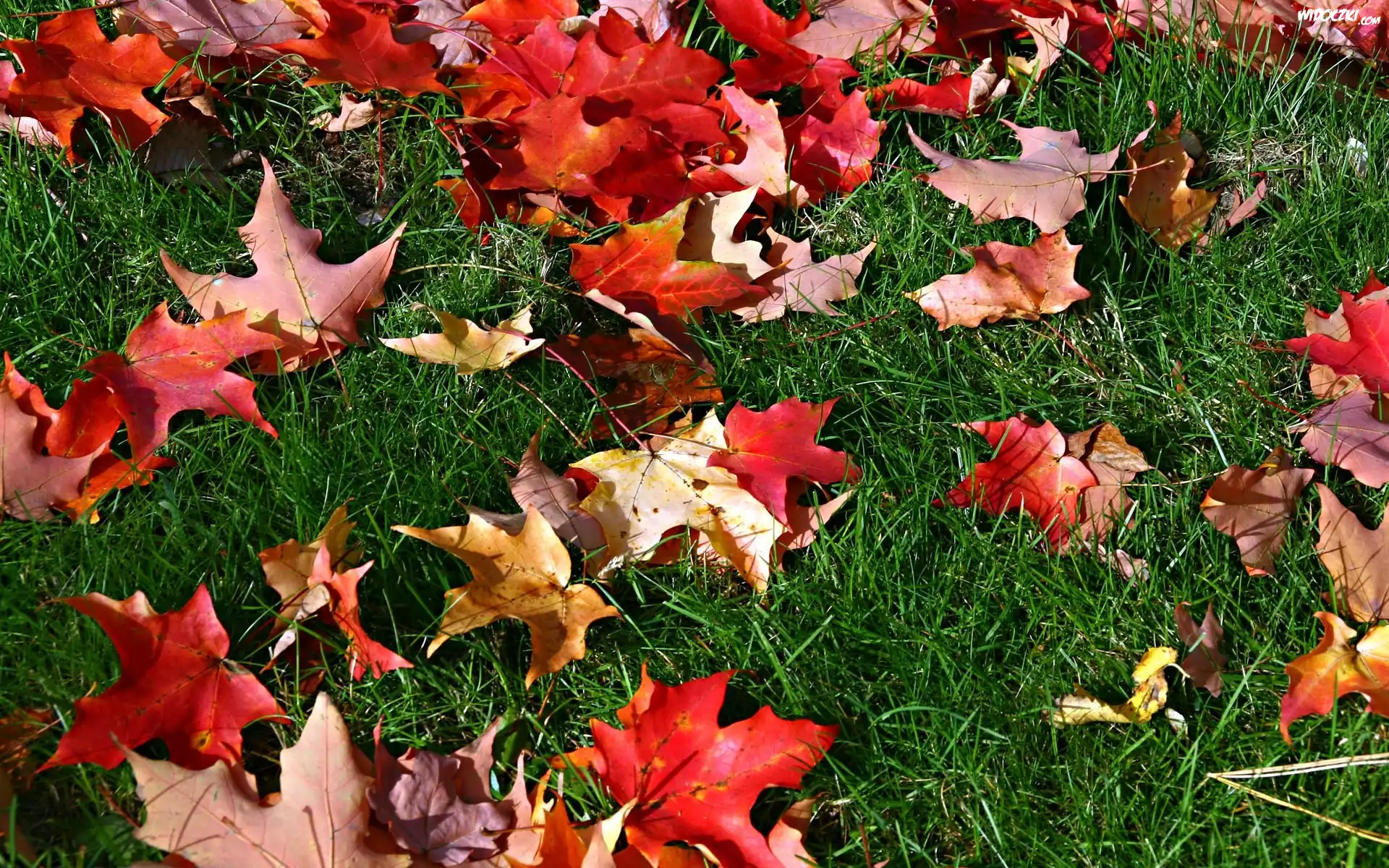 Jesień, Liście, Klon, Trawa