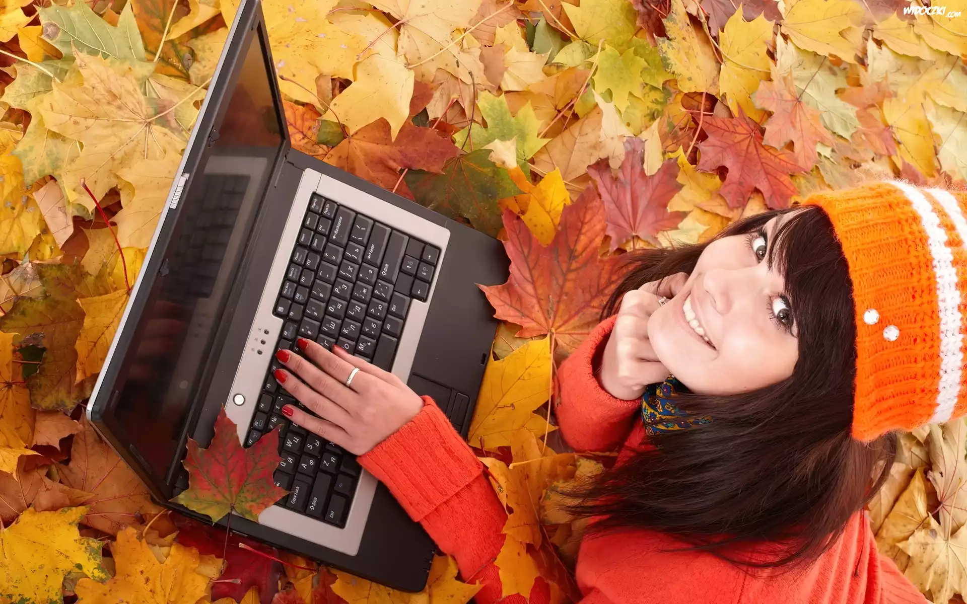 Zdjęcia, Jesień, Liście, Kobieta, Laptop