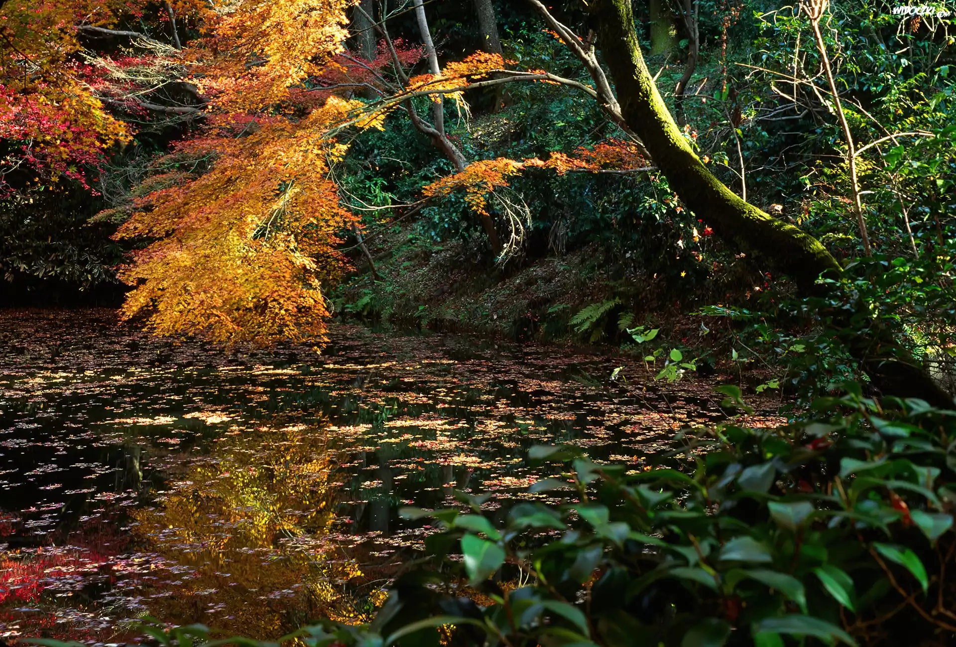 Jesień, Rzeka, Las, Kolorowe, Liście