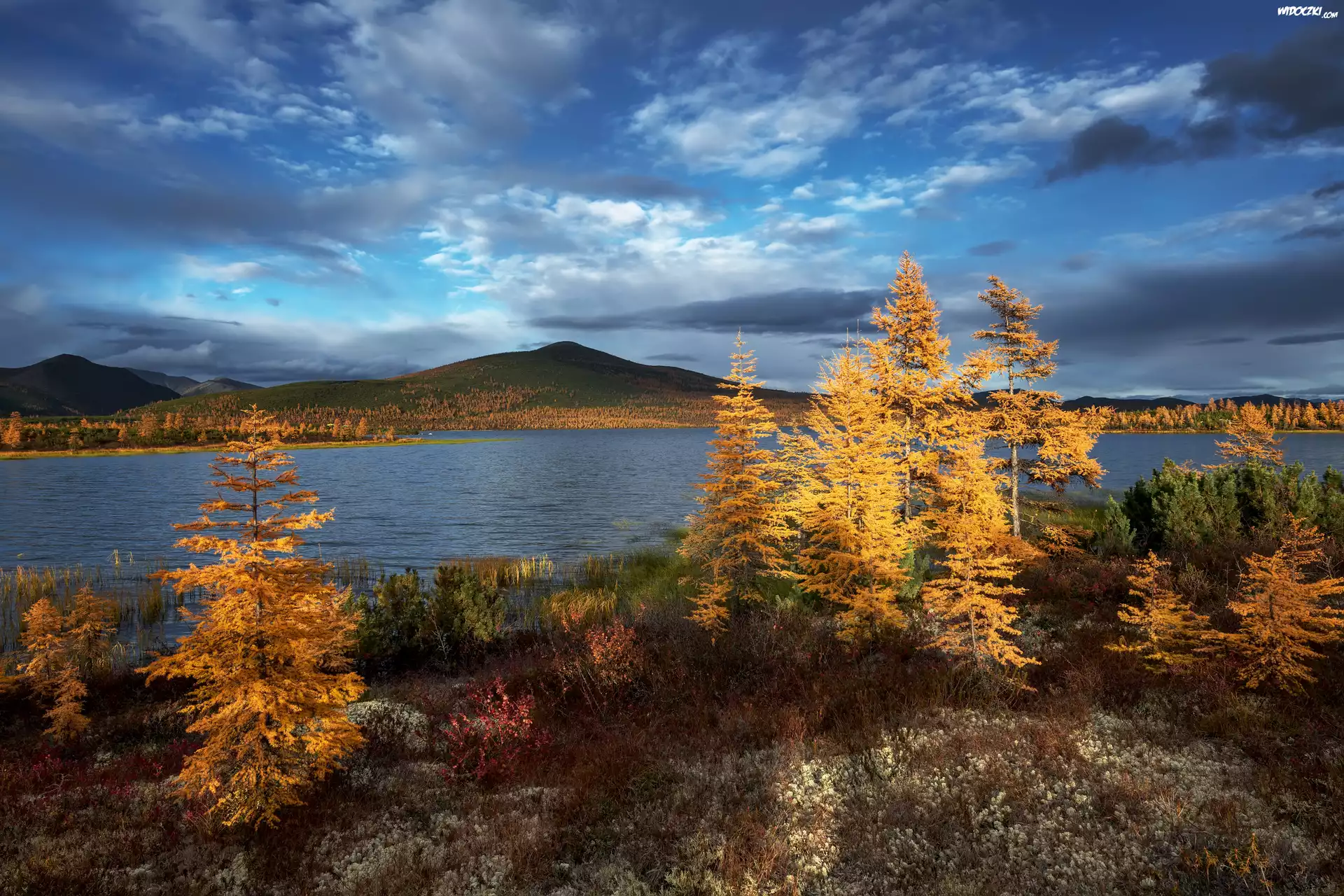 Jesień, Jezioro, Jack London, Drzewa, Krzewy, Góry, Chmury, Kołyma, Rosja