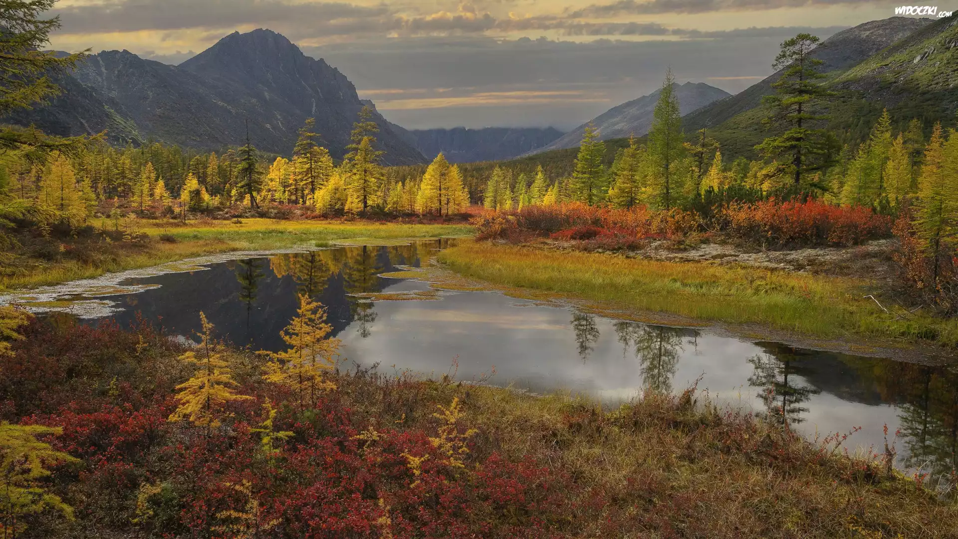 Jesień, Góry, Las, Pożółkłe, Drzewa, Kolorowe, Krzewy, Strumień, Kołyma, Rosja