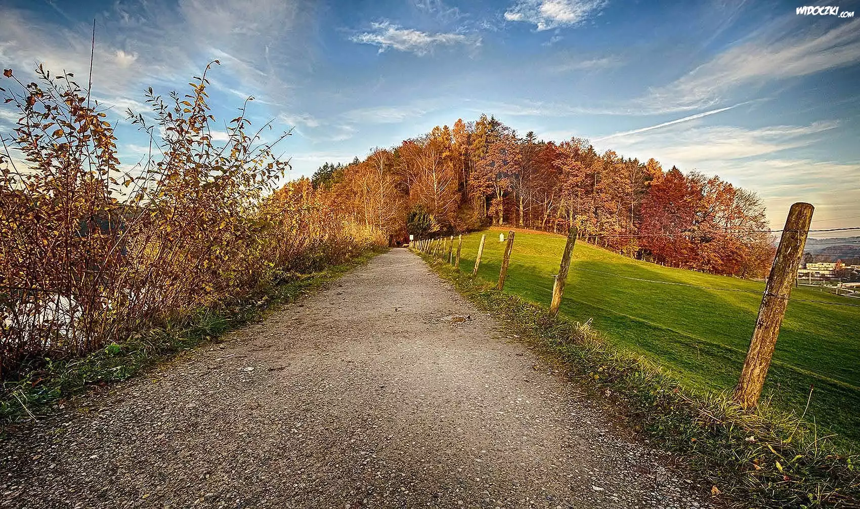 Jesień, Droga, Pola, Drzewa, Krzewy, Ogrodzenie