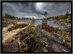 Rosja, Jezioro, Ładoga, Skały, Drzewa, Ciemne, Chmury, Jesień