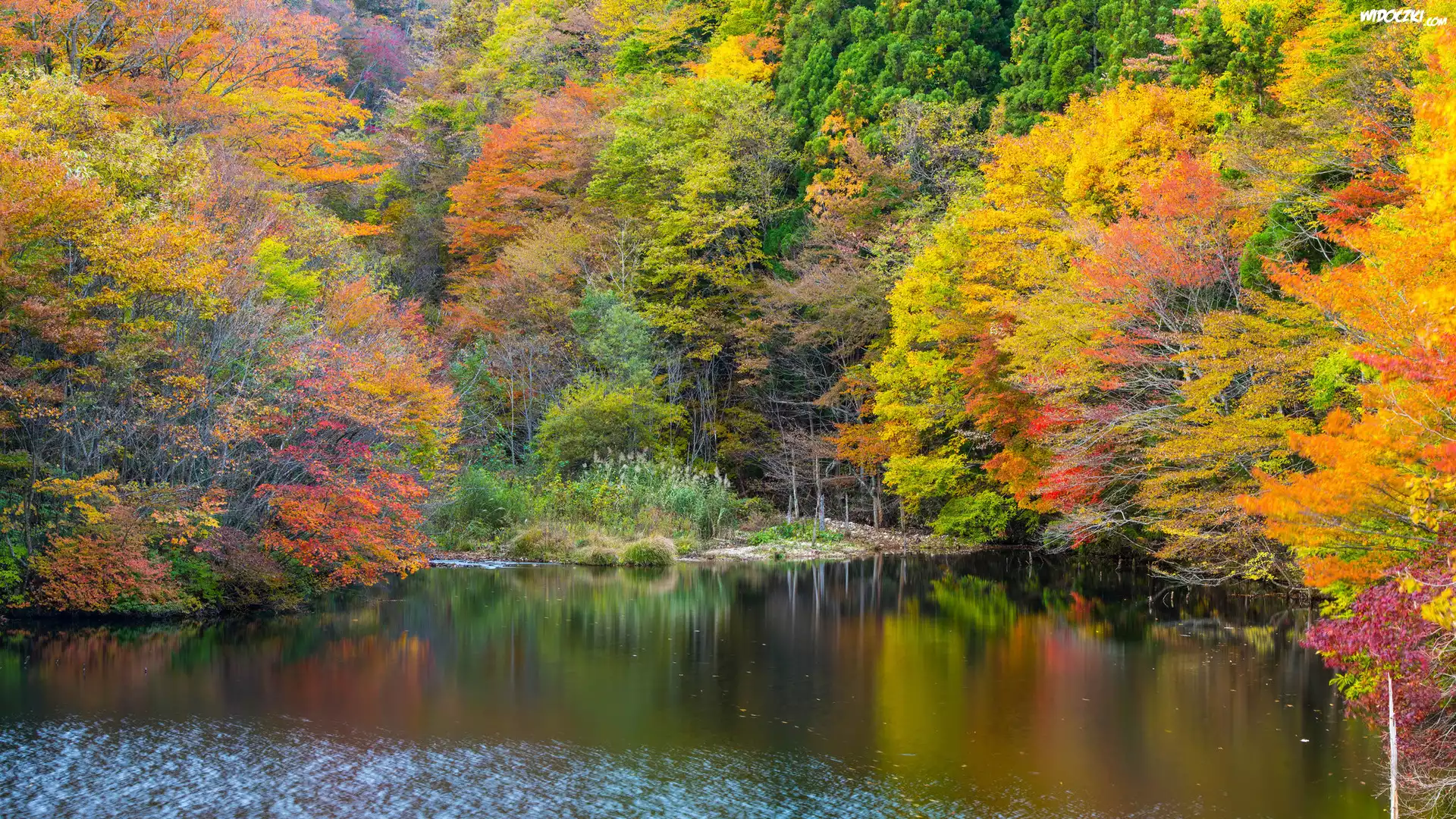 Jesień, Jezioro, Las, Drzewa