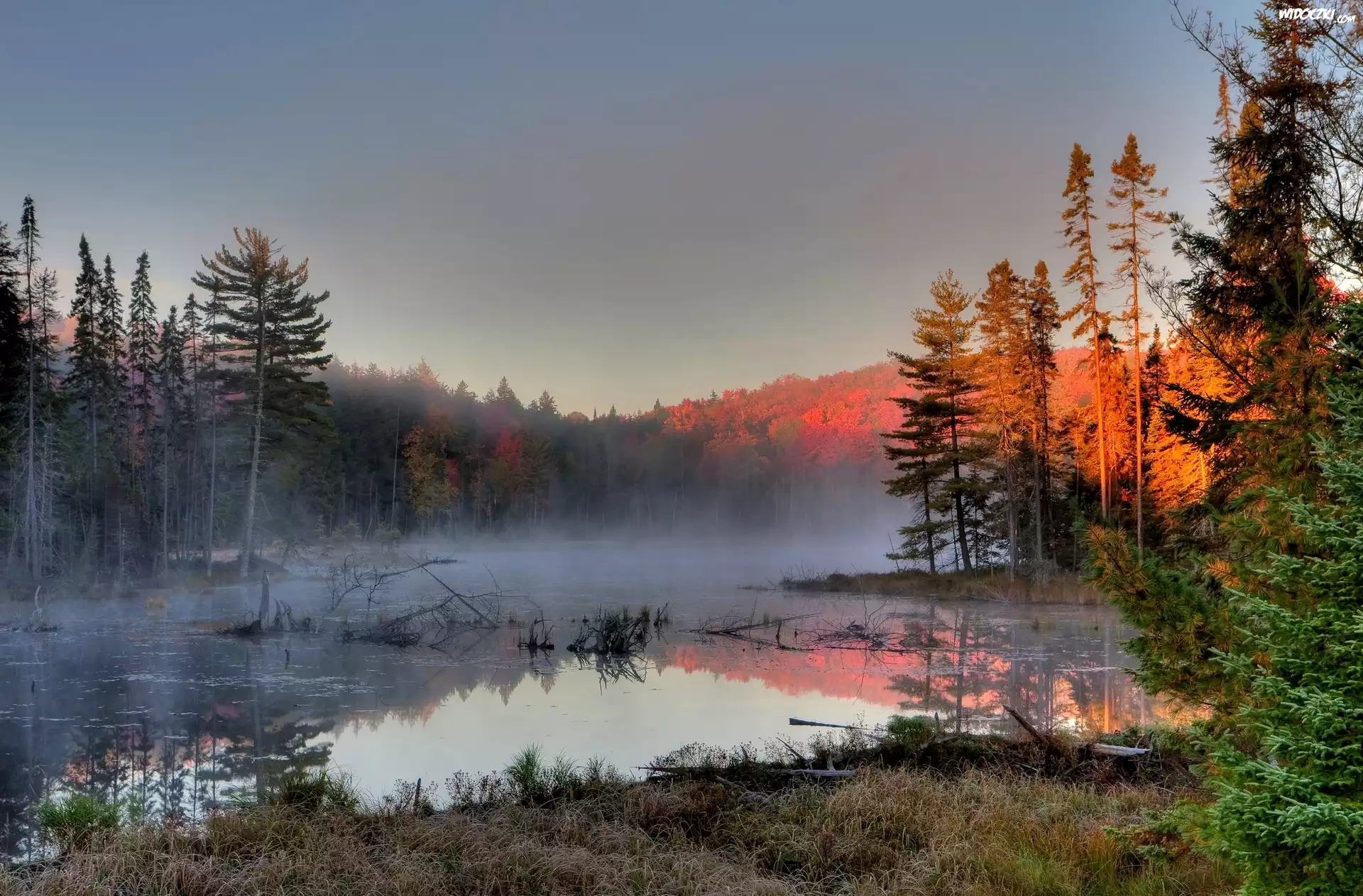 Jesień, Jezioro, Las, Mgła