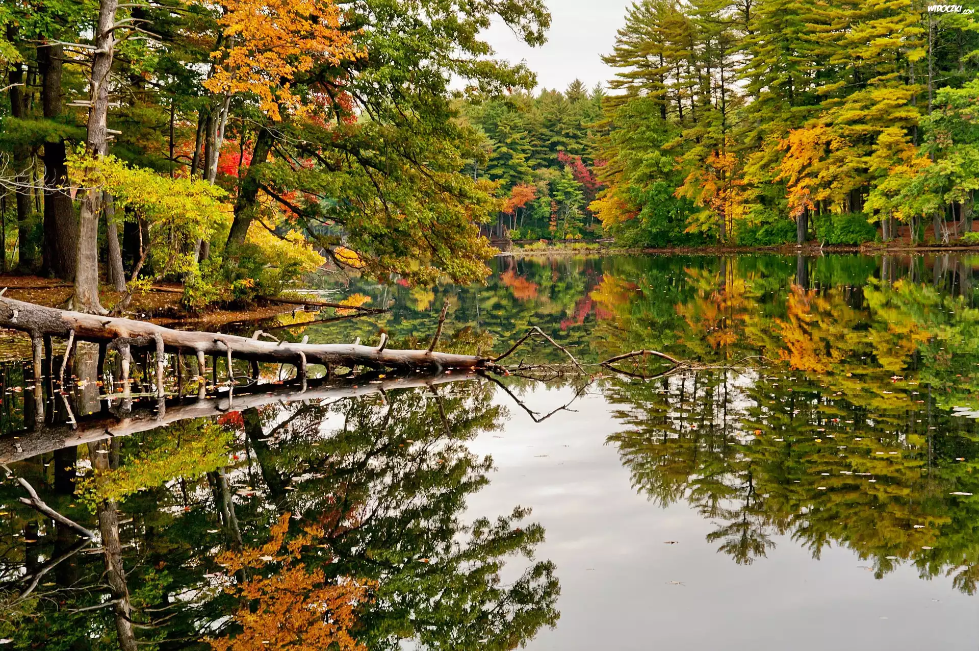 Jesień, Jezioro, Las, Odbicie