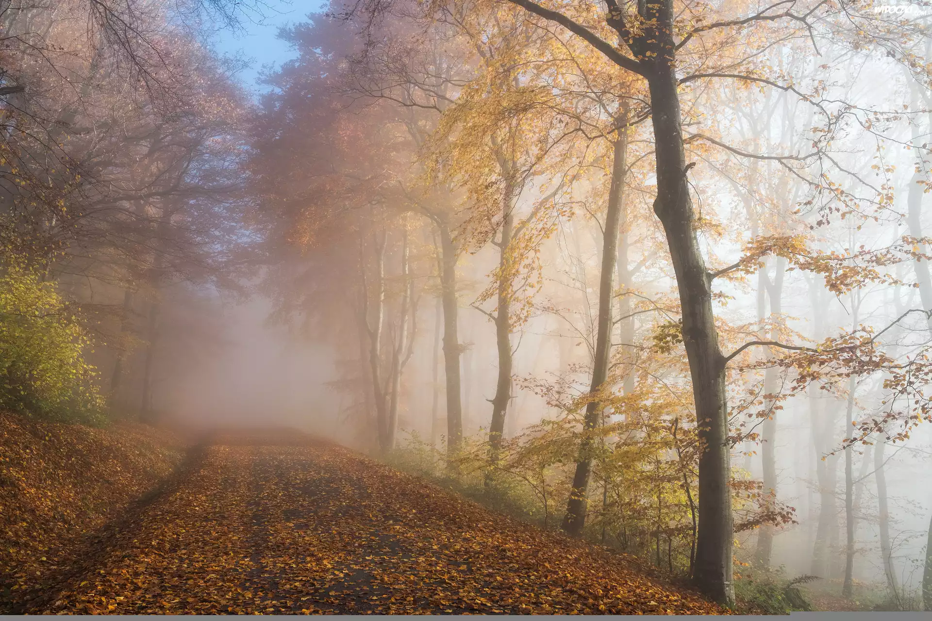 Zdjęcia, Jesień, Droga, Mgła, Las, Drzewa