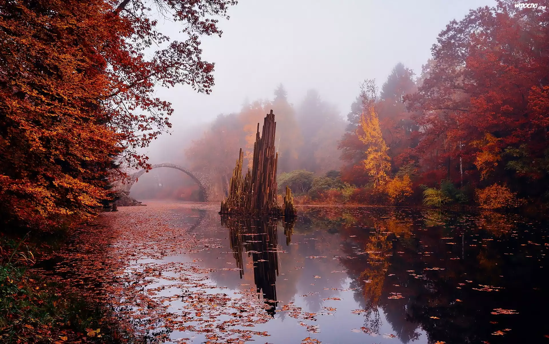Jesień, Rzeka, Most, Las, Mgła