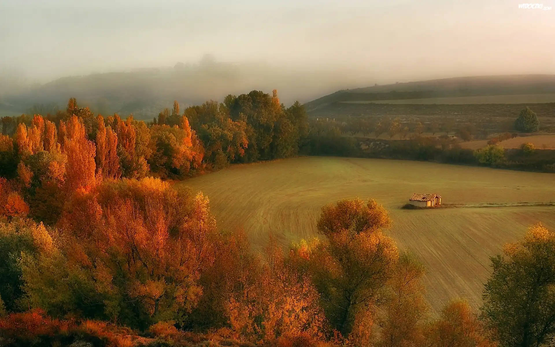 Jesień, Pola, Las, Mgła