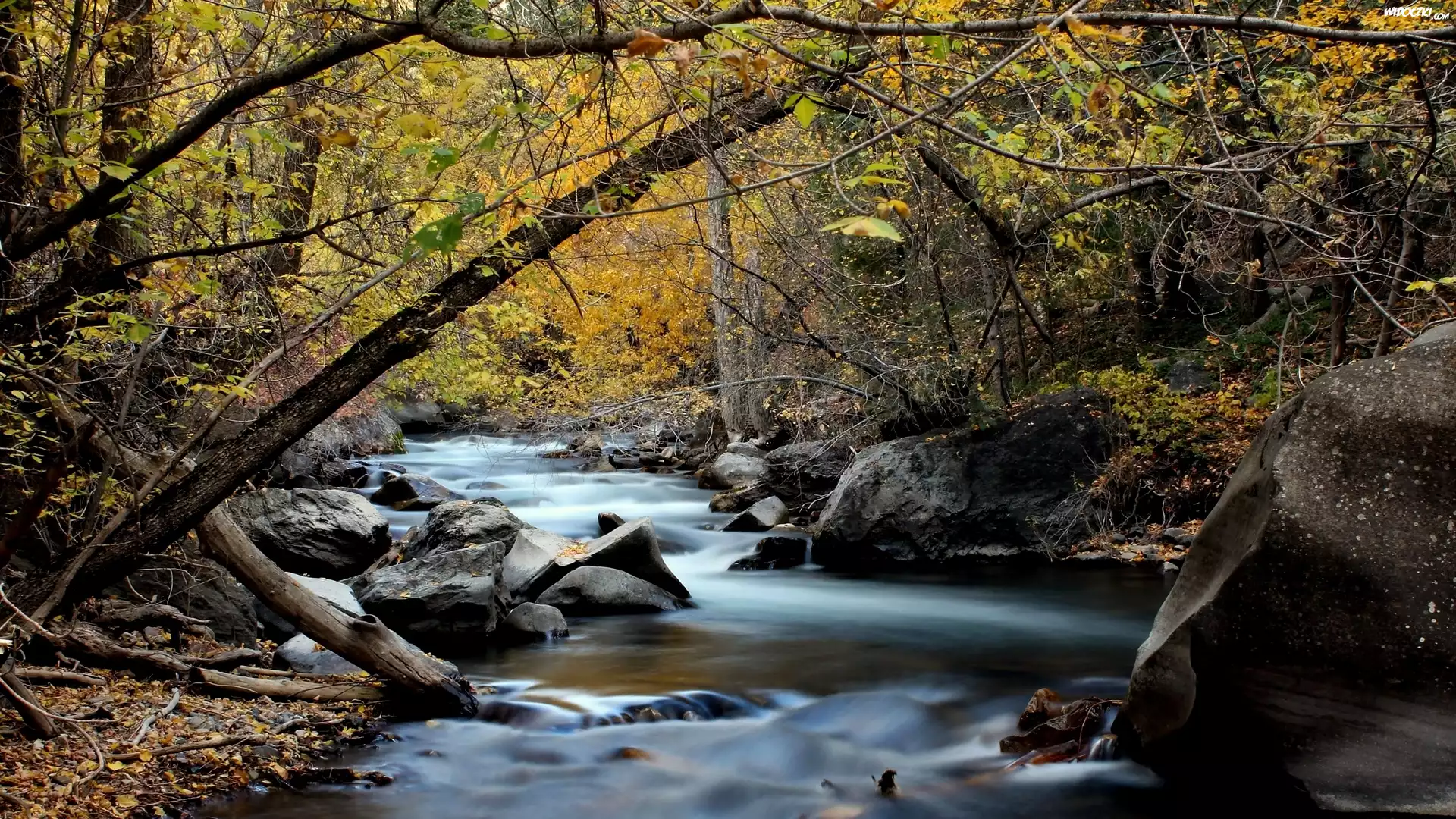 Jesień, Rzeka, Las, Kamienie