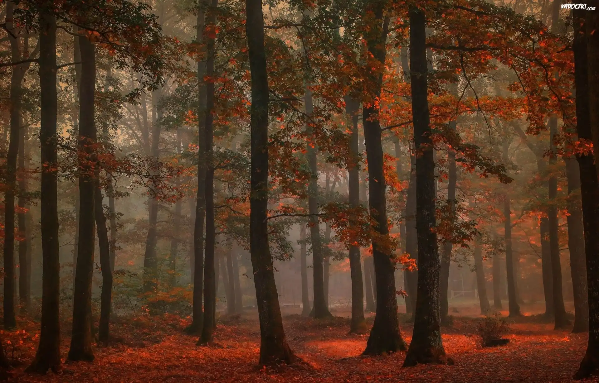 Zdjęcia, Jesień, Mgła, Las liściasty, Drzewa