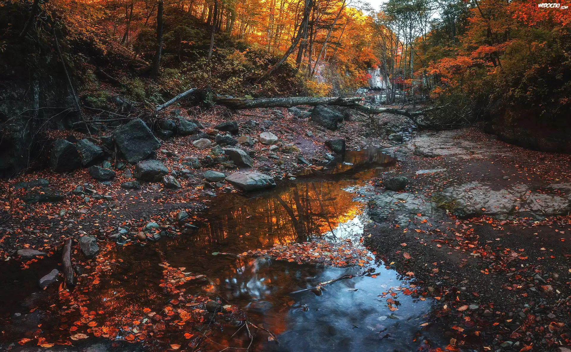 Jesień, Las, Drzewa, Rzeczka, Strumyk, Kamienie, Liście