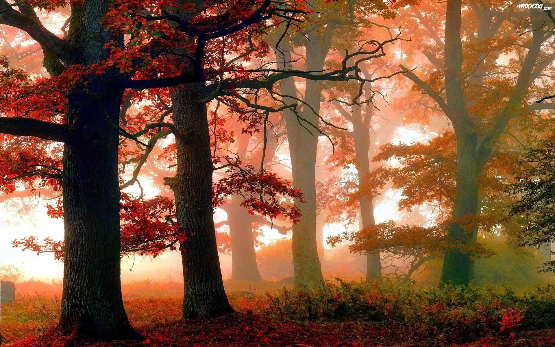 Jesień, Drzewa, Czerwone, Liście, Mgła